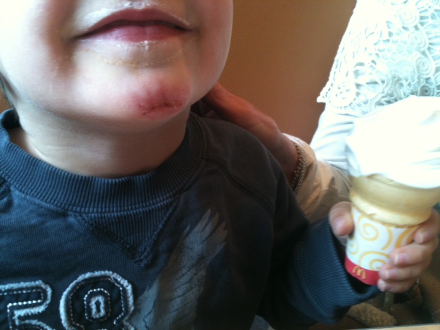 The other week 3 YO Mojo had a tricycle wreck which earned him his first trip to the ER and 6 stitches in his chin.  Those stitches had to stay in for 6 days and unknown to him he had something in common with Ripley, one of our cats.  A week prior to that she went to the doctor to have minor surgery near her eye; which required her to have 6 stitches too.  After that the major difference that he noticed about her was that the cone she wore around her head was convenient for putting his Little People in.