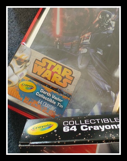 Must resist Star Wars puns……A metal tin with Darth Vader, big boxes of Star Wars Crayola Crayons (with a sharpener in the back and special effect crayons in the box), picture sheets and more.
