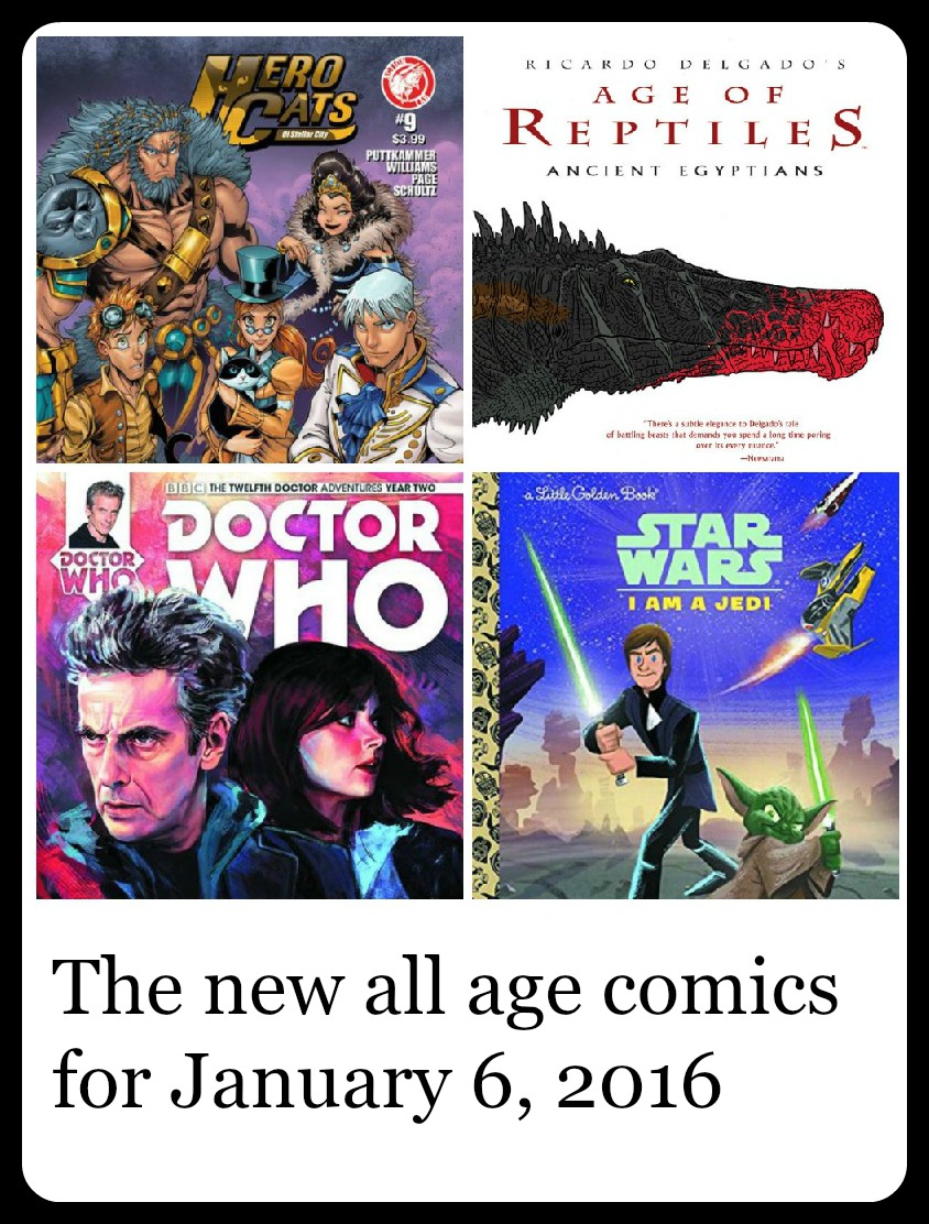 Happy New Year-the first #NCBD is nigh or at least near and there are lots of options for readers this week. One of our top 10 graphic novels for 2015 is released this week, Age of Reptiles: Ancient Egyptians. The individual comics came out last year and this series is wordless, features beautiful art and good for ages 8 and up.