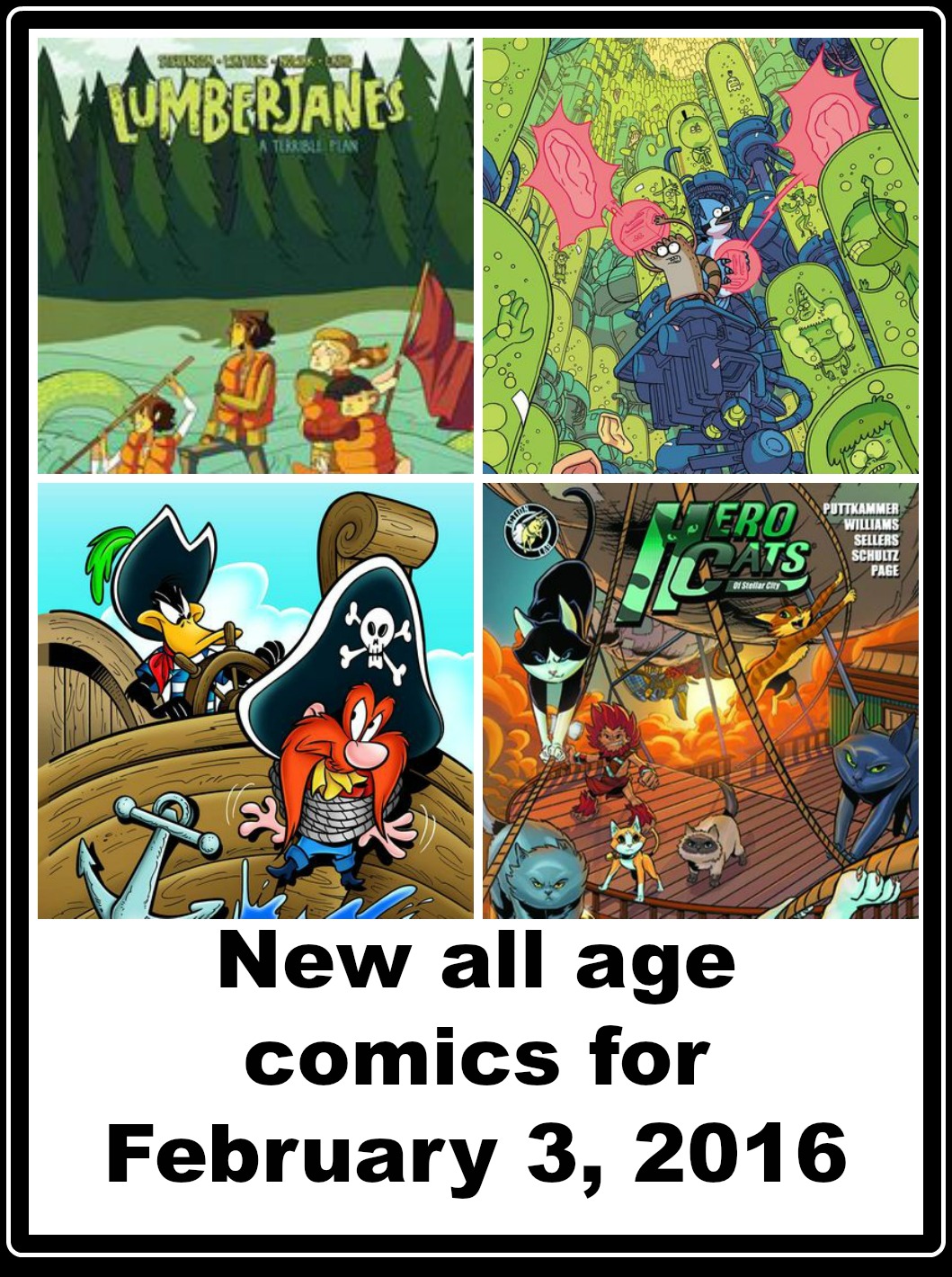 All age comics, regular show, looney tunes, hero cats, doctor who, lumberjanes, free comic book day