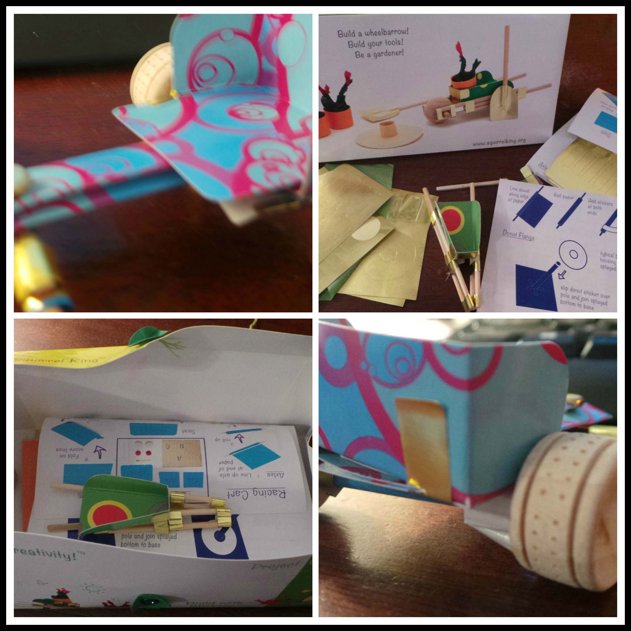 Each pack has everything that you need to create the wheel barrow, car or whatever it is you’ll be building. Be careful not to unpack its contents until you’re ready to start. Our over-zealous helper dumped everything out on the table and misplaced one stick that was about 2’ long. Thankfully in our case we were able to cut a toothpick to approximately the same width so that the project would work.