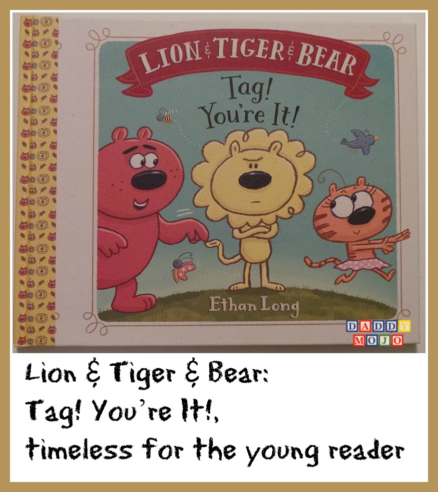 Our oldest son has an old soul and not just by virtue that he was first born. He can be quite the contemporary child and run with his friends, talk about Star Wars and make up silly stories. There are moments though, as with any child, when his old soul gets the better of him and he just wants to chill out. He’ll doodle, do a connect the dots or a word search while his friends play outside-and that’s OK. Allowing children to find their space and making it OK for them to be in that area is the backbone of Lion & Tiger & Bear: Tag, You’re It!. It’s a book for young readers 5-7 that has big illustrations, fun characters and a timeless vibe that is created by the sum of its parts.