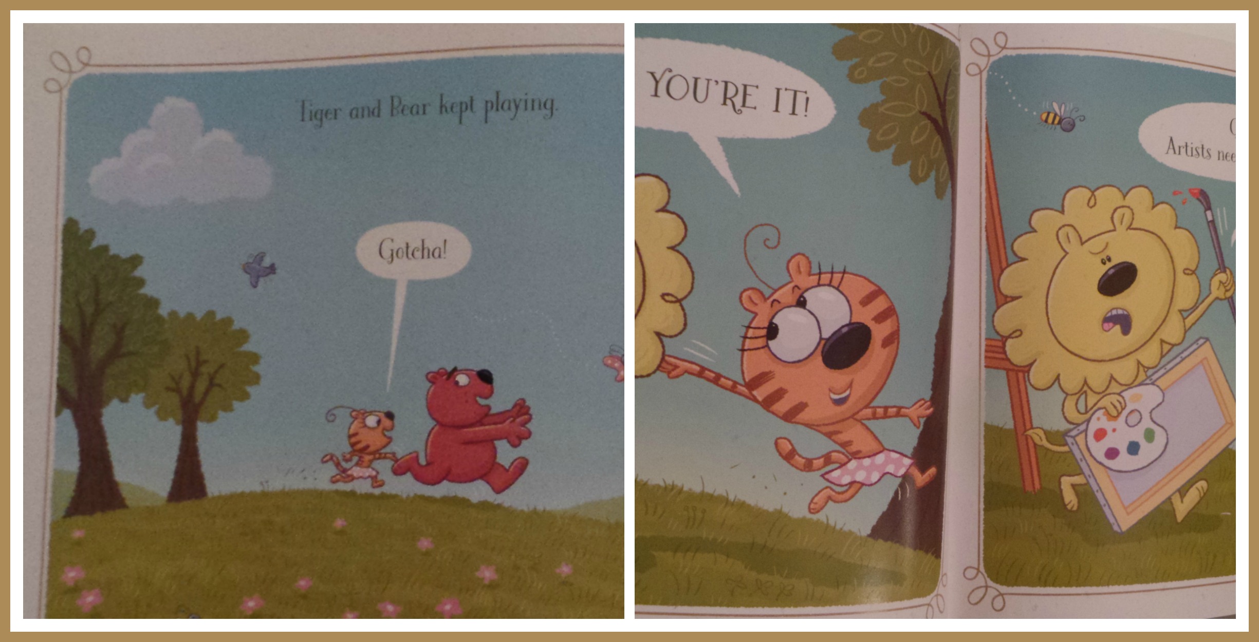 Lion in Lion & Tiger & Bear is an artist and all he wants to do at this moment is paint. He’s got his easel out, paint on the ground but is constantly being bothered by bear or tiger to play tag. It’s a simple premise that is played out very well in a way that kids will understand and learn from, much like our old-soul older son.