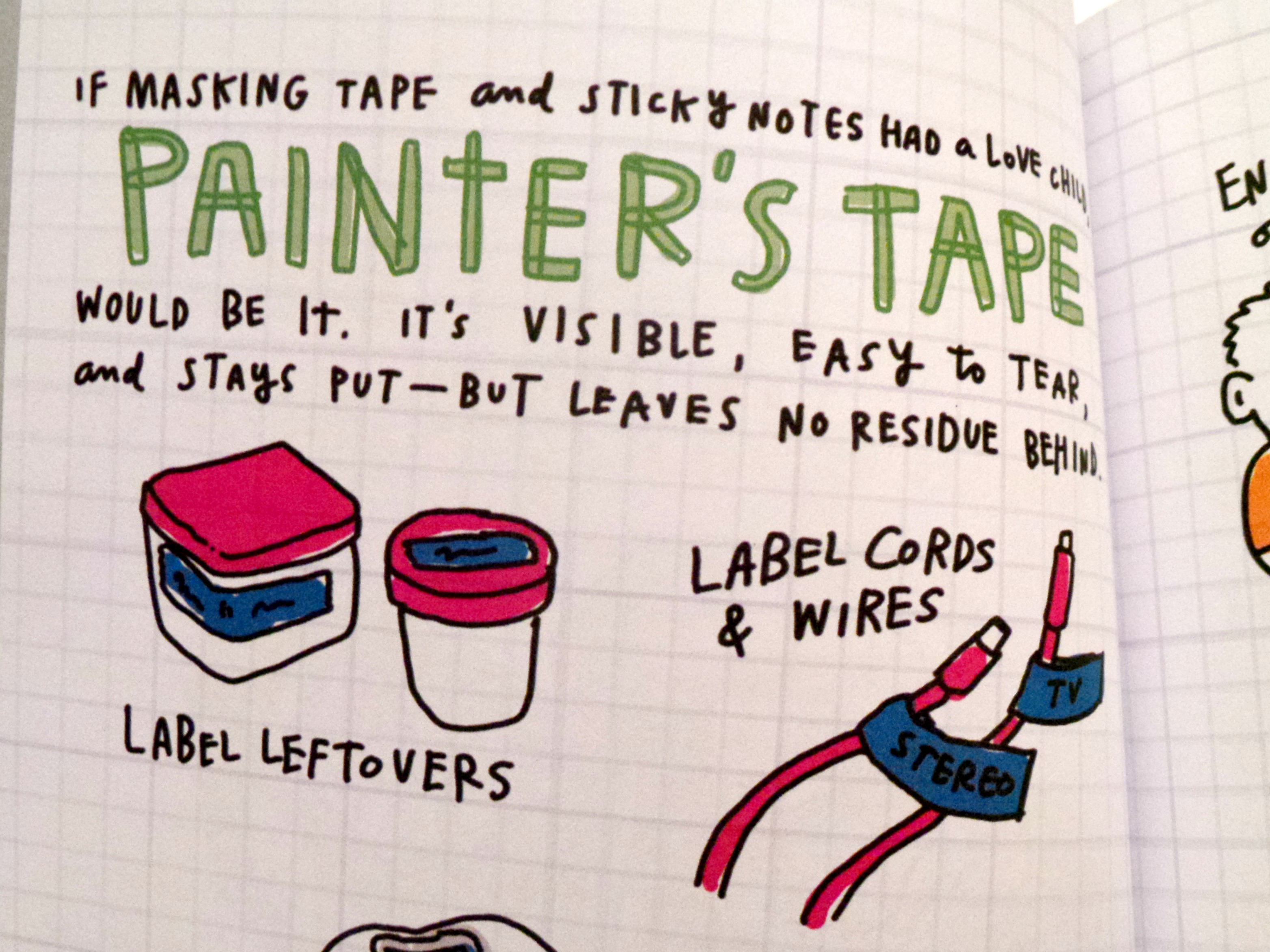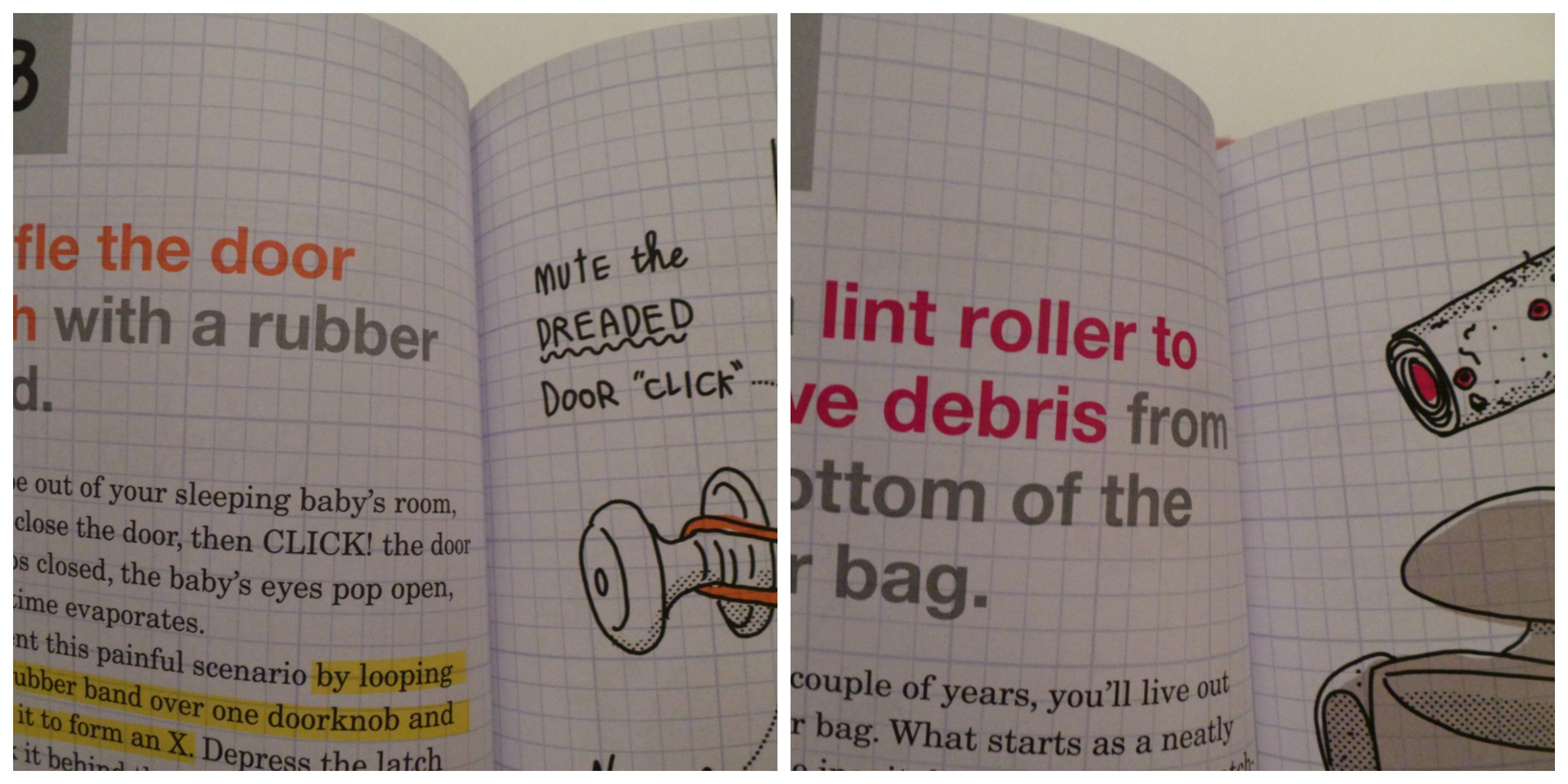 Sure, by that description you’ve read or seen books like that. What makes Parent Hacks unique and more effective is its brevity. Most of the hacks have an illustration on one page and enough sentences to fully explain it on the opposite page. The grid background, different colored pages, varied size of the text, as well as the fact that it’s multi-colored and highlighted is reminiscent of notes that you used to take in school.