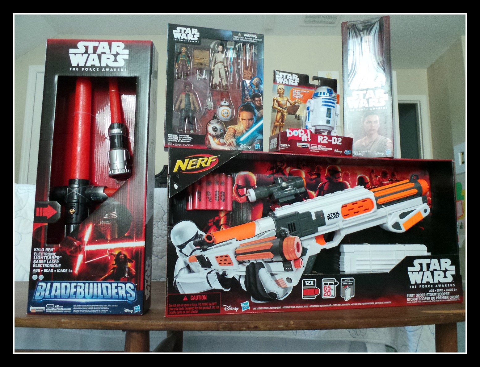 We celebrated Star Wars Day early, as well as a couple of times since initially playing with the toys. Our 6 year old invited some friends over to play with a Star Wars Nerf Episode VII First Order Stormtrooper Deluxe Blaster, Kylo Ren Electronic Light Saber, Bop It! R2-D2, Star Wars The Force Awakens Hero Series Rey from Jakku, Action Figures from Takodana Encounter, a Stormtrooper and Darth Vader mask.