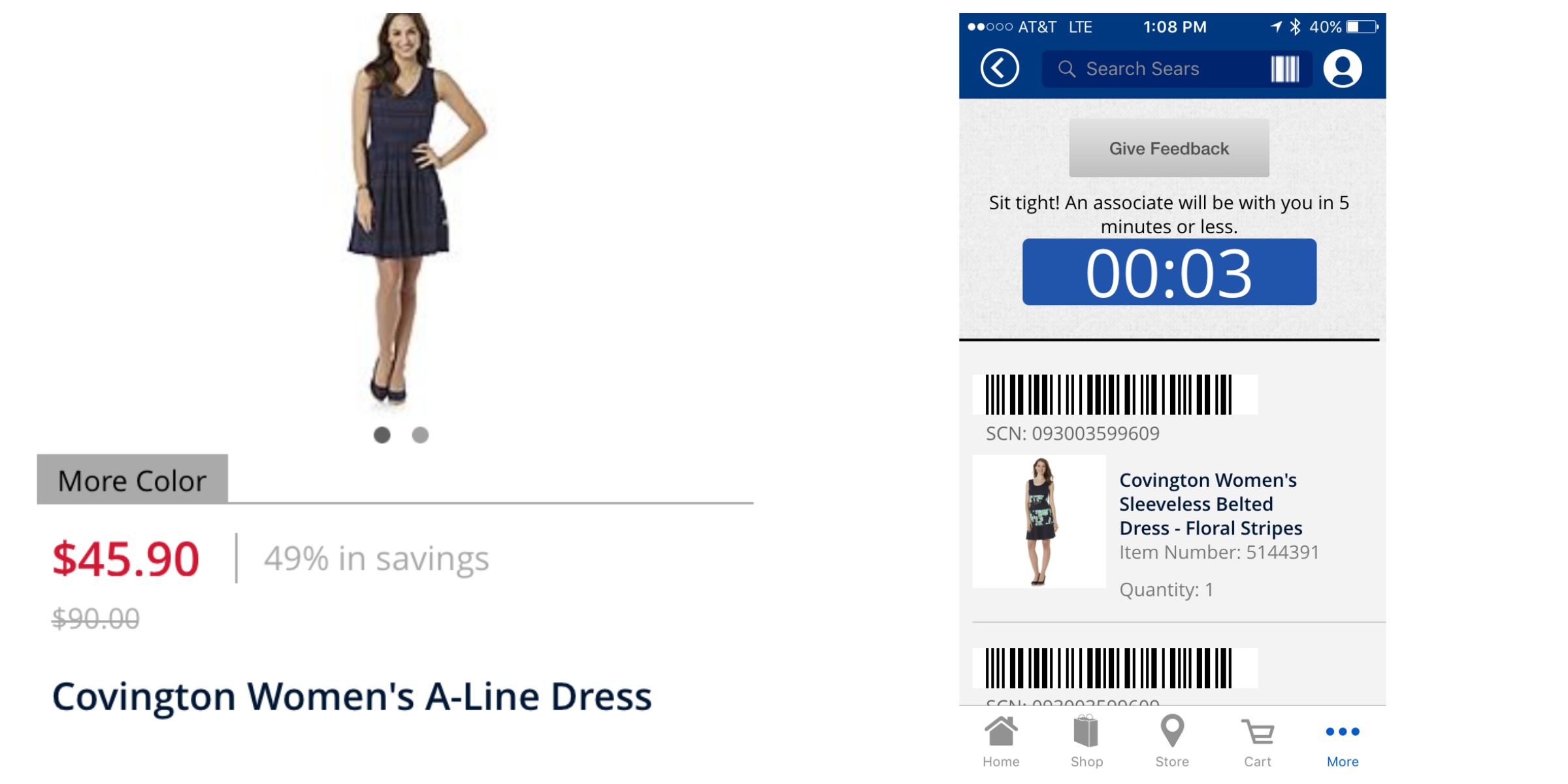 We opened the Sears app, searched for A-Line Dresses and found a couple cute numbers that she’d be quite happy with. We selected one, deleted that; got another one and then some shoes for me. Even online I’m a bad shopper with the attention span of a cat video.