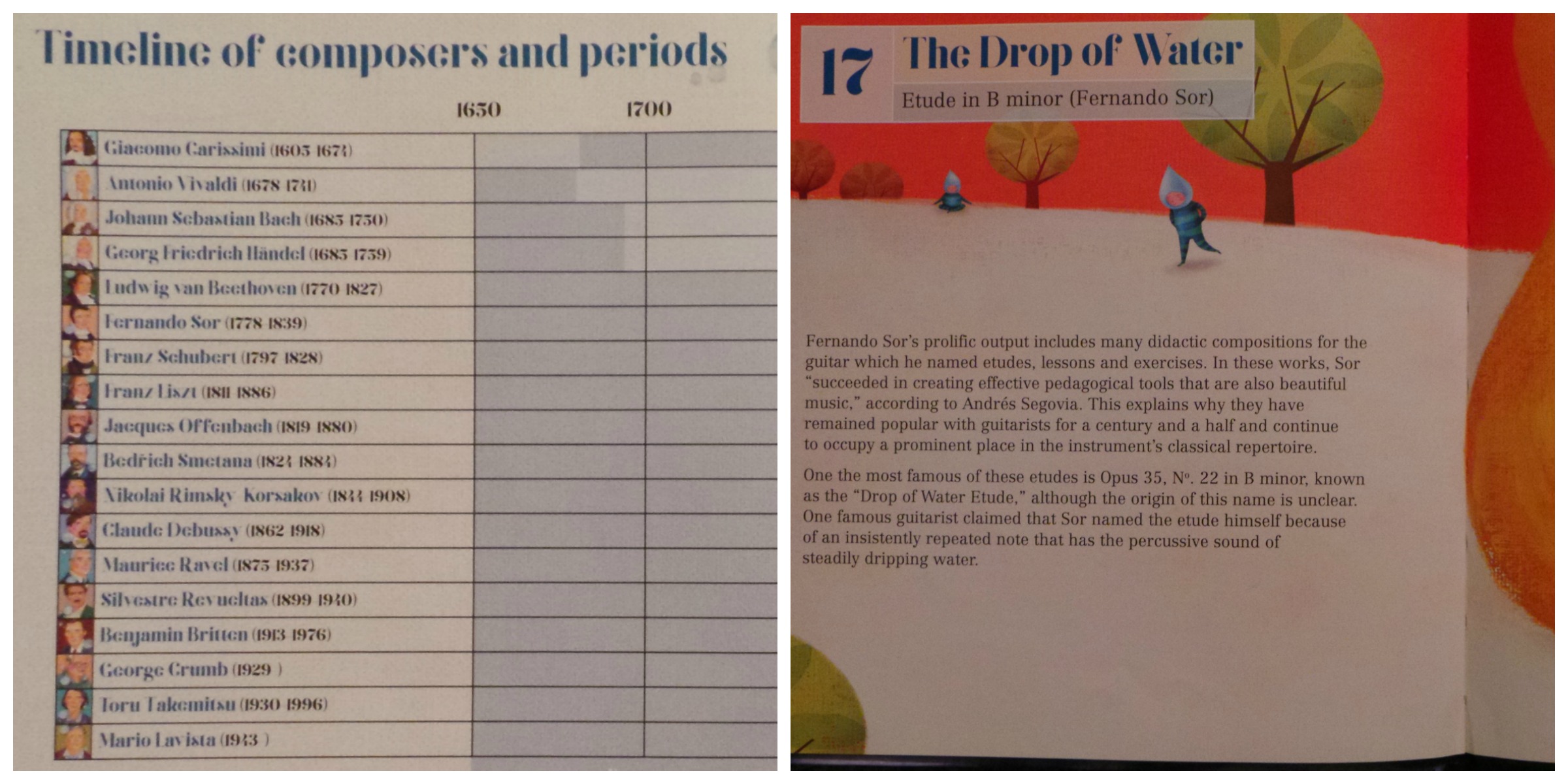 The book is much thicker than you expect, features an overview, detailed explanation of each piece, its title or background on the composer. Each of those overviews comes with some nice artwork that would also be at home in a children’s book. Keep reading and you’ll find the listening guide next that tells background information on each piece. It roughly tells you what types of instruments you hear, what makes it unique and uses advanced musical terminology so that any age can legitimately learn things.
