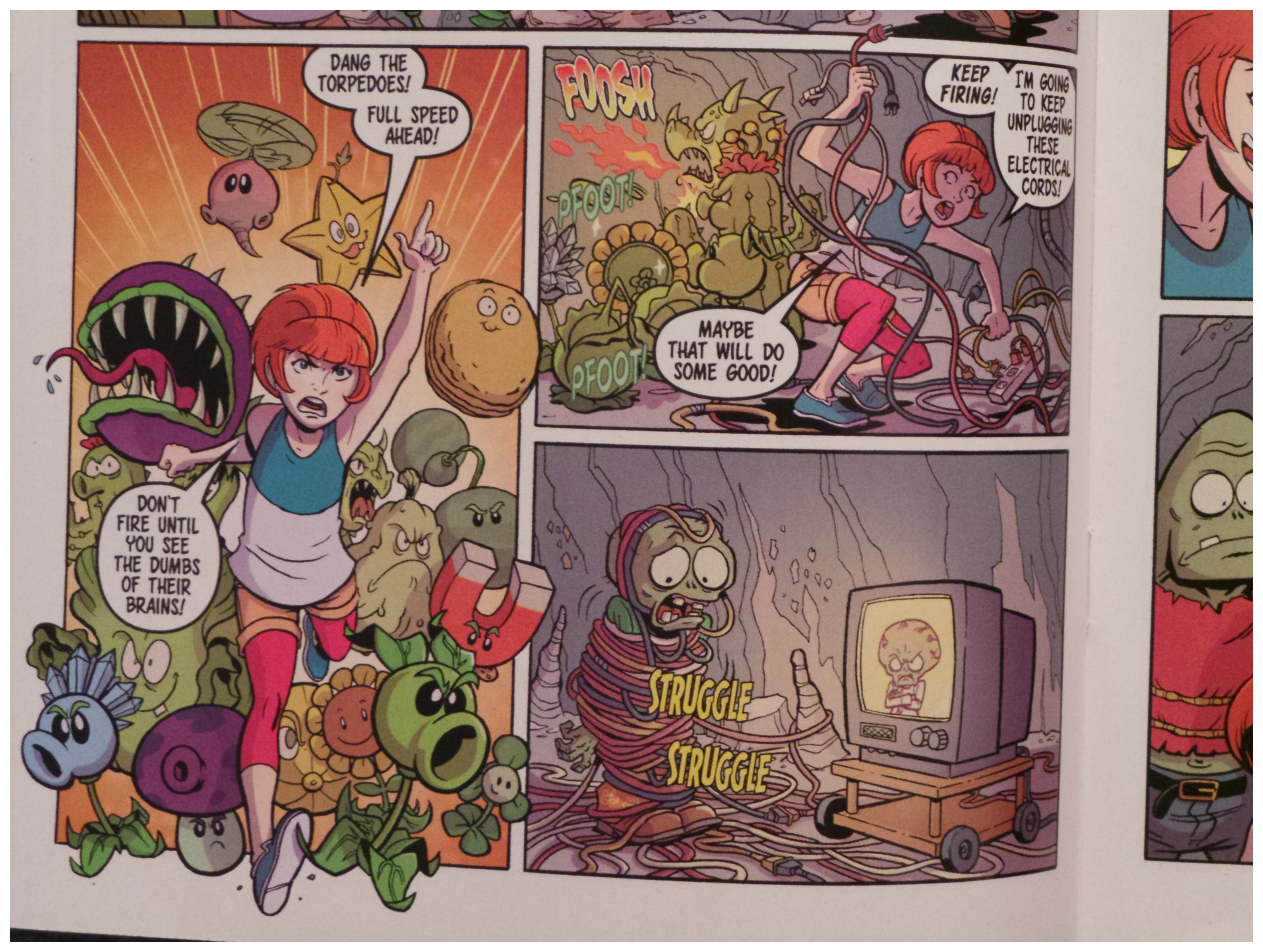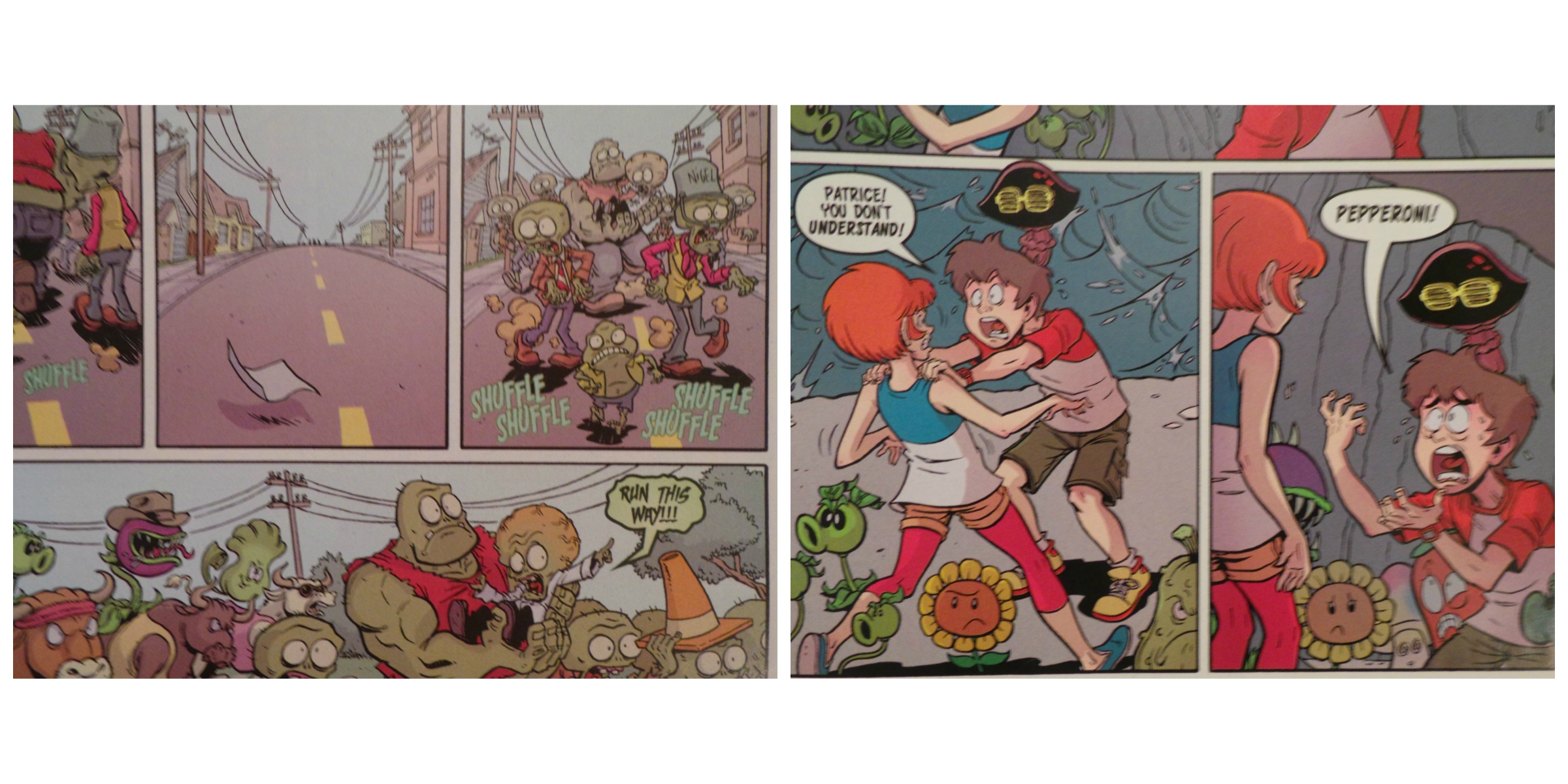 We learn why Boom Boom Mushroom is called that when Nate and Patrice find it, but are promptly cornered by a group of large zombies. What I really like about Plants Vs. Zombies is the detail in the artwork. The panels are standard size, but are jammed with so much vivid detail that it really propels the story forward. I also enjoyed the droll, sarcastic wit that’s written into some of the dialogue.