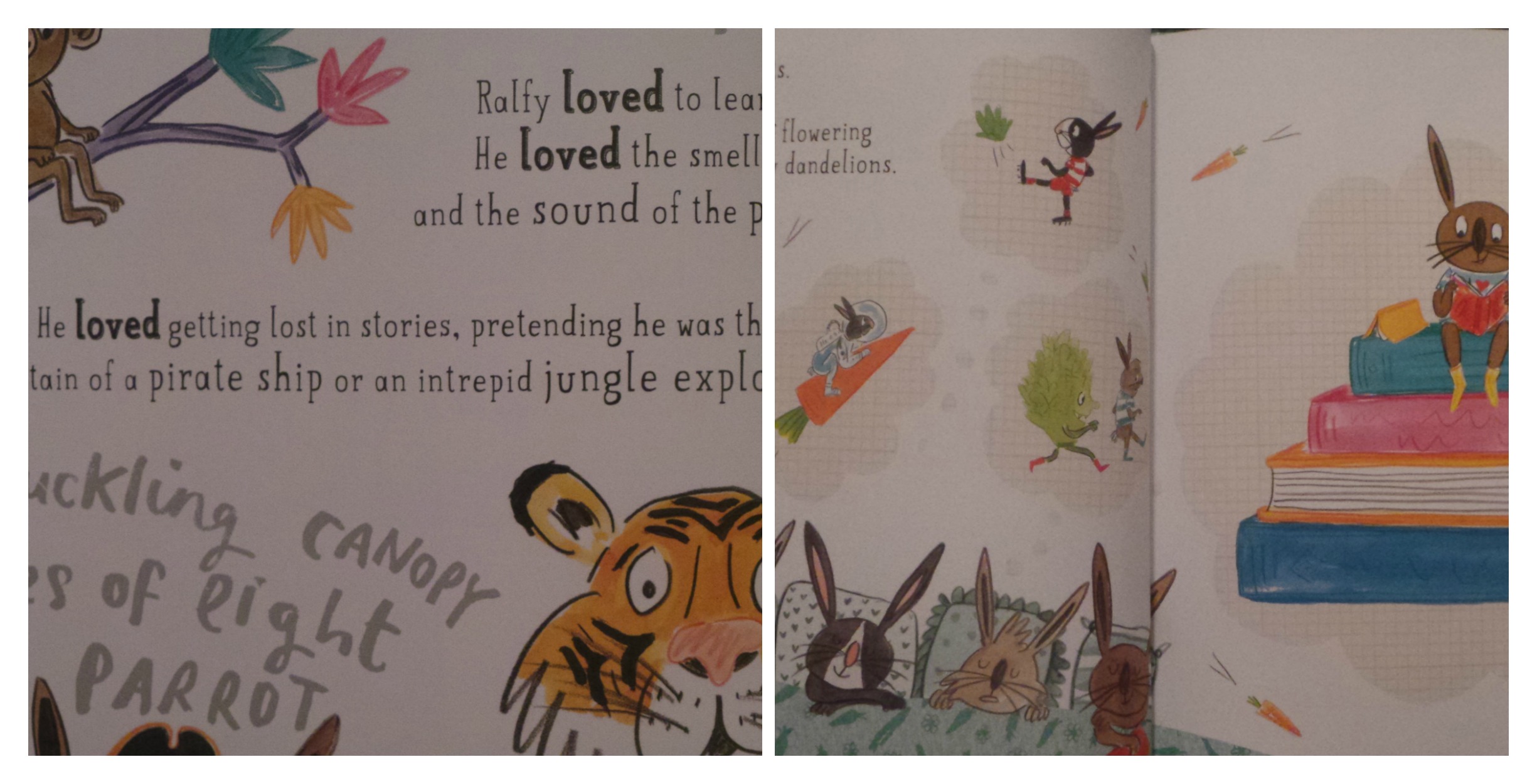 Wanted! Ralfy Rabbit, Book Burglar meets and exceeds all of the requirements that we have for a great good-night book. This is the kind of good-night book that parents can read more than once (because it’s not too long), has a variety of colors on the background, different sized text and artwork that makes young readers and parents smile. Wanted! Ralfy Rabbit, Book Burglar feels like a classic book. The book doesn’t crib ideas from earlier sources, it’s entirely original, but after reading it you can feel its old soul.