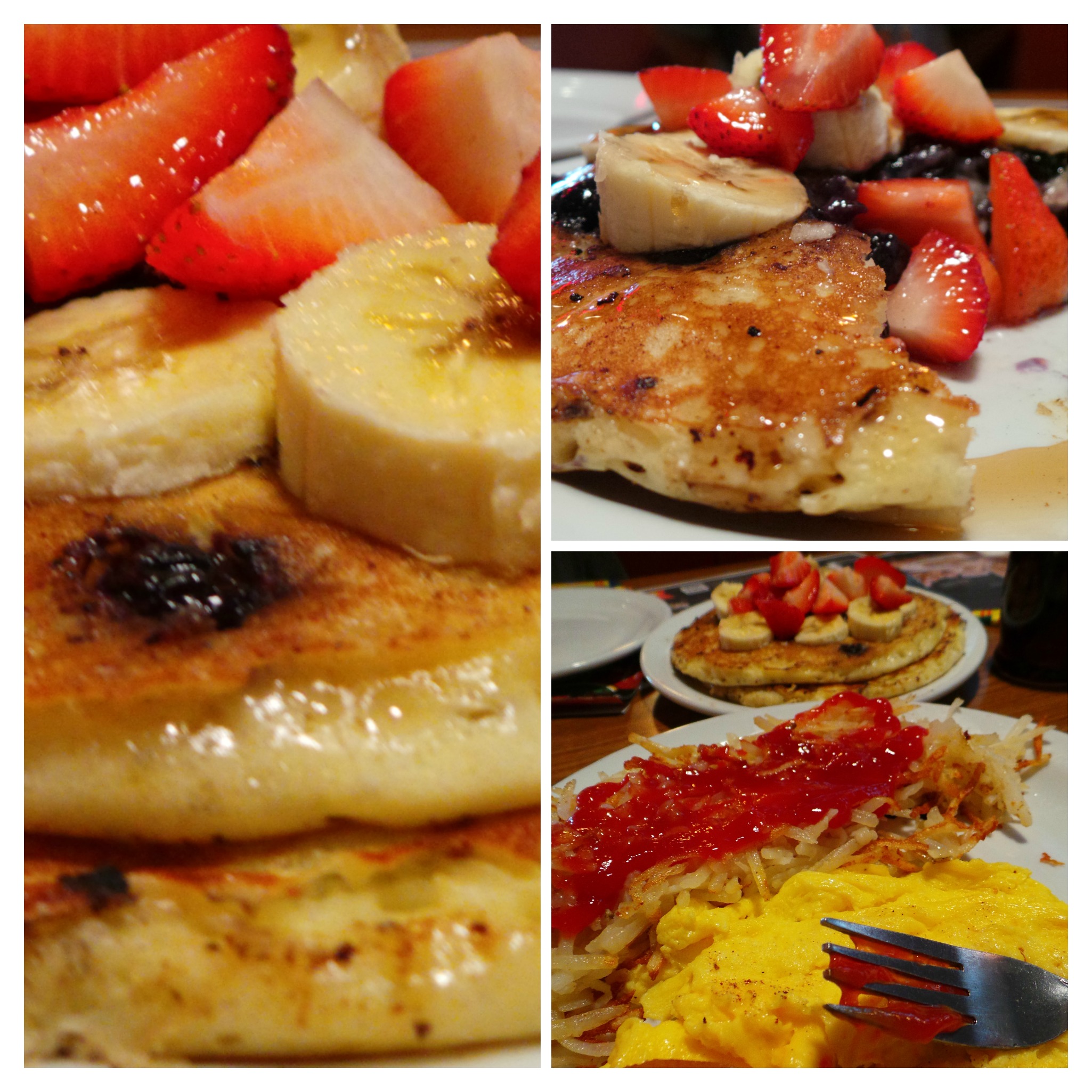 Now look at the pancakes using the new recipe at Denny’s that we had the other day. They are much thicker, have visible holes on the side and seem to actually have flavor on the top of them. We had blueberry pancakes that day and that accounts for some of the color, but even excluding that they had more life and did taste better.