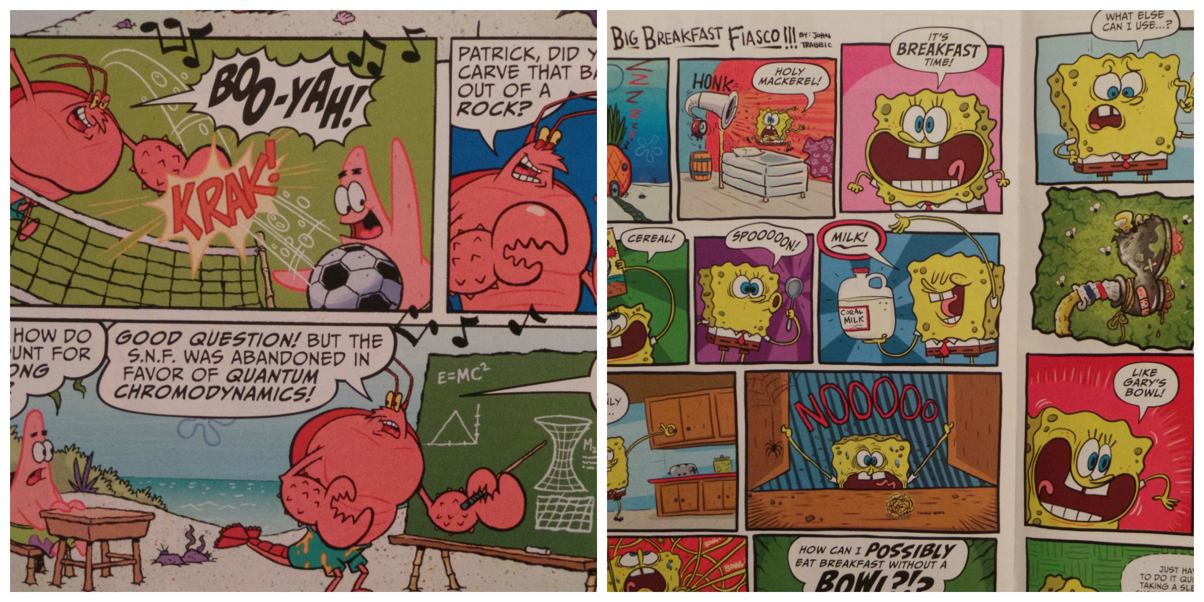 The characters in SpongeBob Comics behave exactly the same as you know from the television show. The difference in how they look is entirely up to the artists. For example the art in the final story, The Great Big Breakfast Fiasco by John Trabbic is obviously SpongeBob, but he’s more rounded and looks different than the one drawn for television.