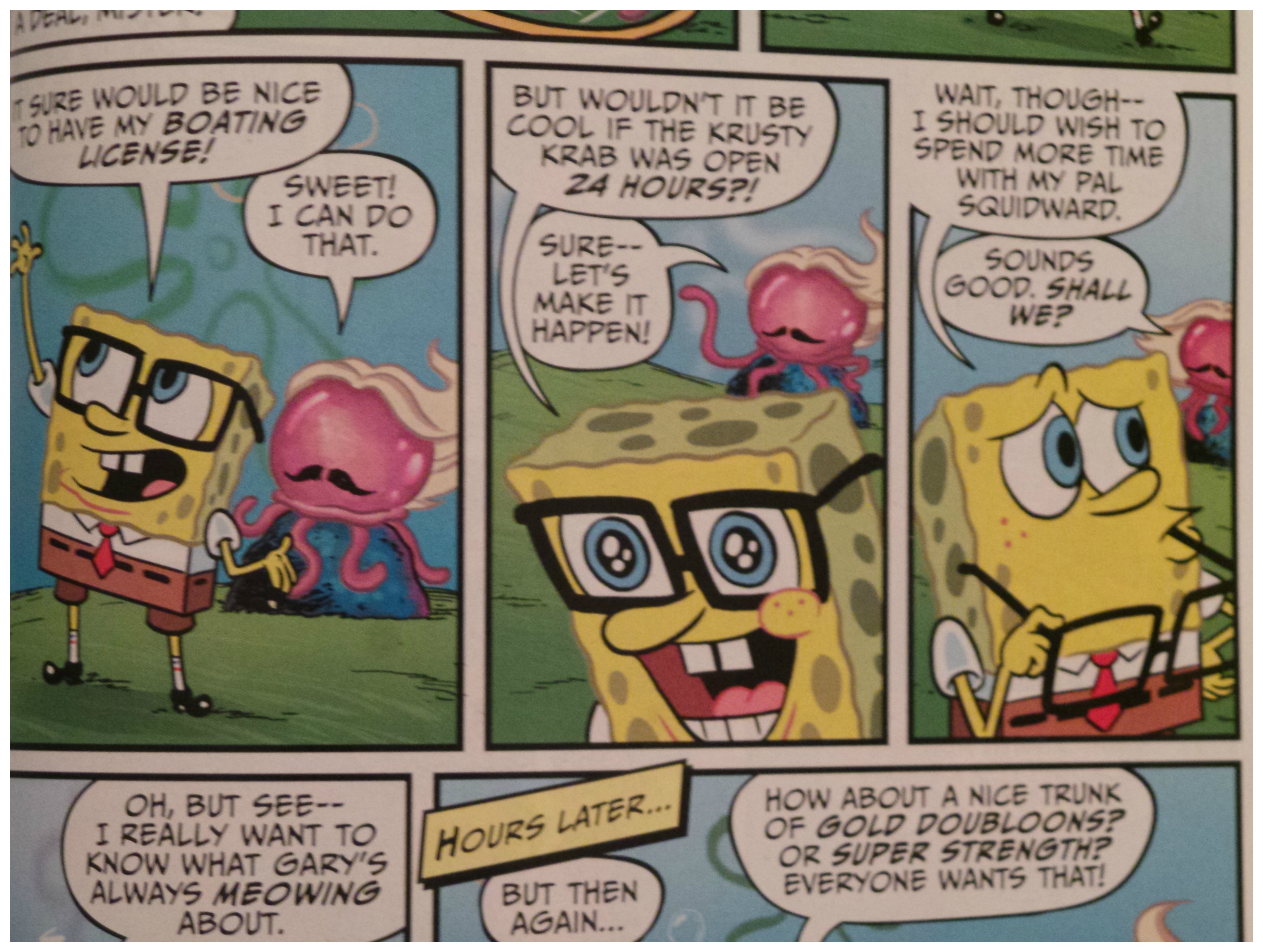 32 pages is a great length for a comic book. If the comic is no good then it’s just filler, but thankfully for the audience SpongeBob Comics has lots of pages and manages to make them all work. This is a silly comic whose main story is one where Larry and Patrick get lost and sea and then marooned on an island. There is a little potty humor with Patrick’s breath being bad enough to power a sail and create sea monsters. The only other thing that parents could object to is when Larry says that he hates Patrick. However, that is done in such a way that it’s obviously sarcastic because it’s just before he cries over their friendship.