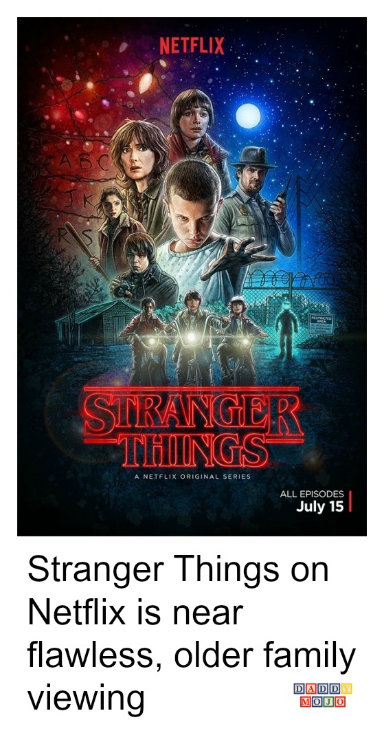 The rating on Netflix is 14+ and that’s where we’d put it too. There are a couple choice words in the first episode that helps display the friendship between the main four boys. It’s the way that 14 year old boys talk to each other, but is also inappropriate for them to say in the presence of adults. Otherwise the show merits that rating based on thrills, drama and a taut script that makes the best of scaring you with very little. If you have kids 14 and up this is great quality family viewing, with just a bit of scare, for all.