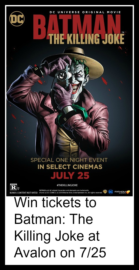 This giveaway is for a pair of passes to Batman: The Killing Joke on Monday, July 25 at 7:30 p.m. It is rated R (have I mentioned that…?) for graphic violence, torture, brief nudity, a couple sexual references and some instances of bad language.