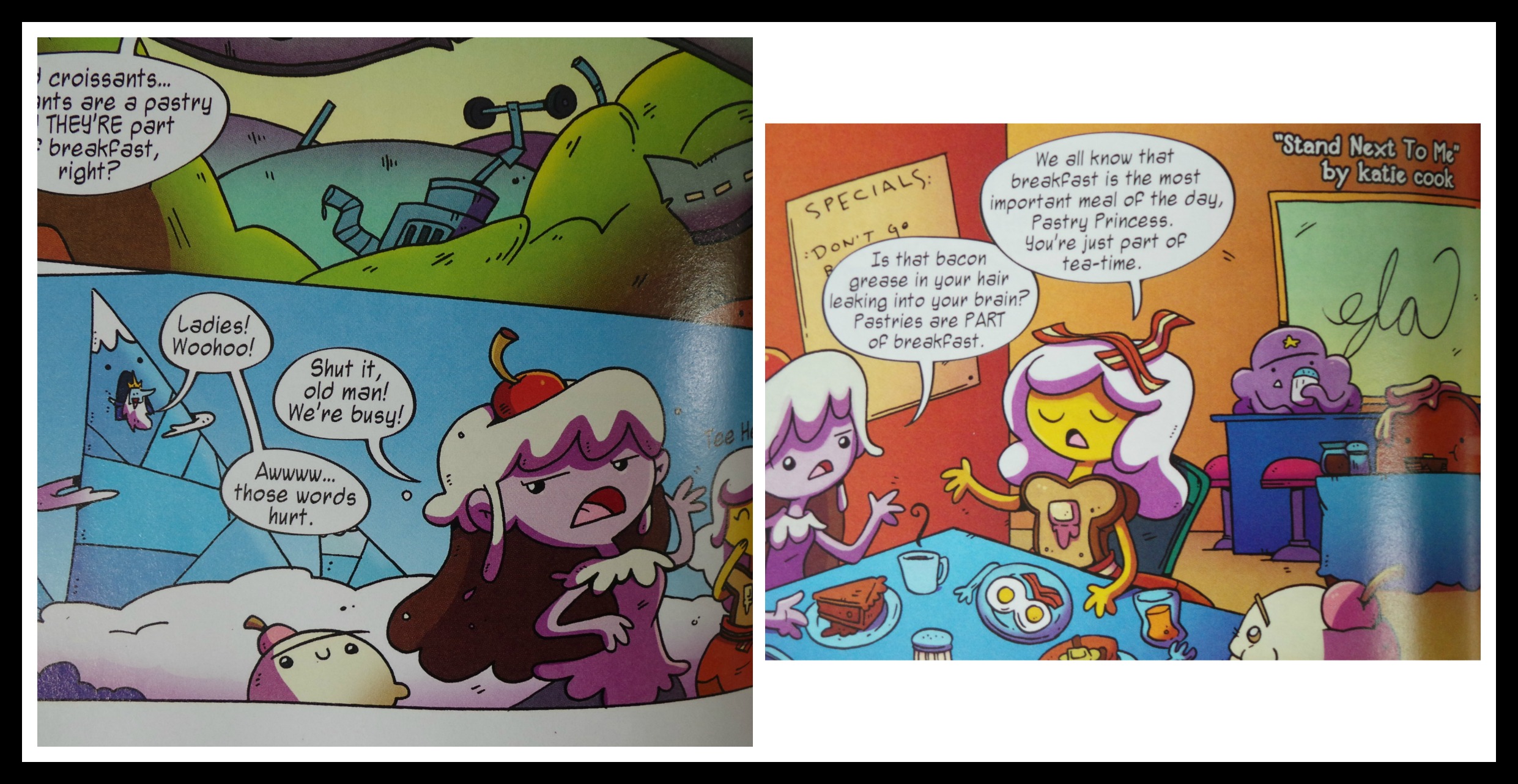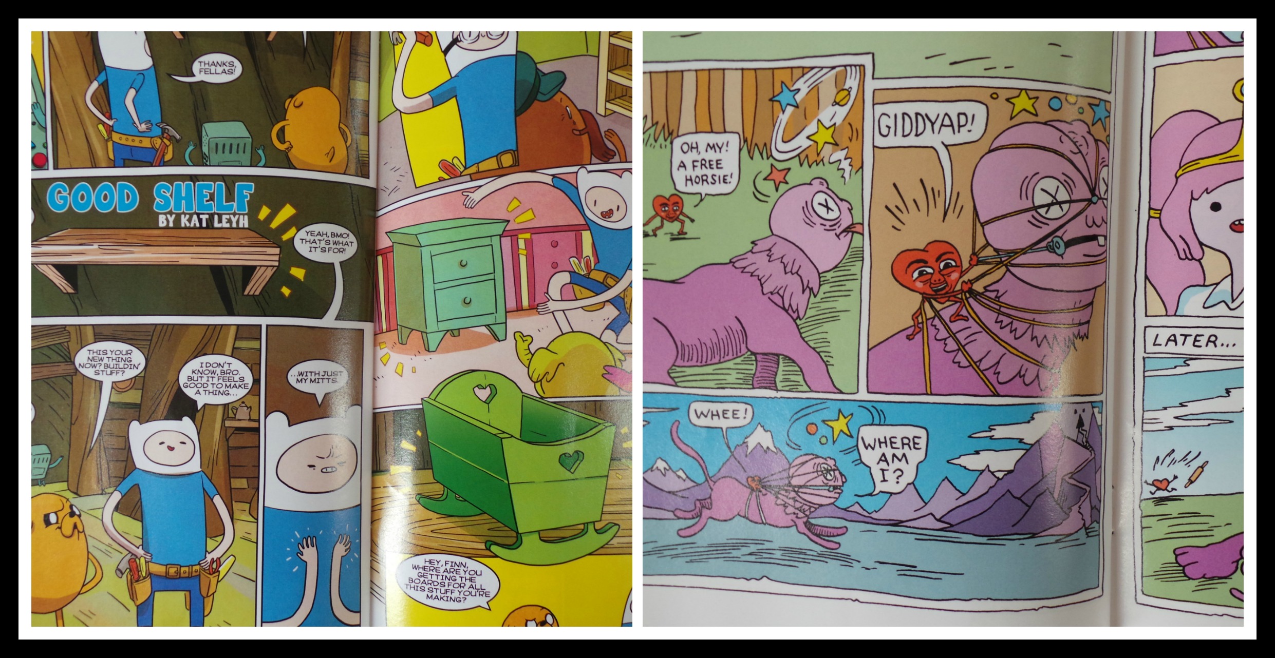 Stand Next To Me is written and illustrated by Kate Cook, whose work will look familiar to My Little Pony fans. Tony Millionaire does the story and art to Goliad Gets a Break, a fable oriented tale. And Kat Leyh handles the last story, Good Shelf about a book shelf that’s made from cursed wood. Leyh’s interpretation is the closes look to what Adventure Time looks and feels like, for us, it’s also the best story in the book. It’s kind of a bummer that this story was also the shortest, with any luck she’ll be in future episodes with longer stories.