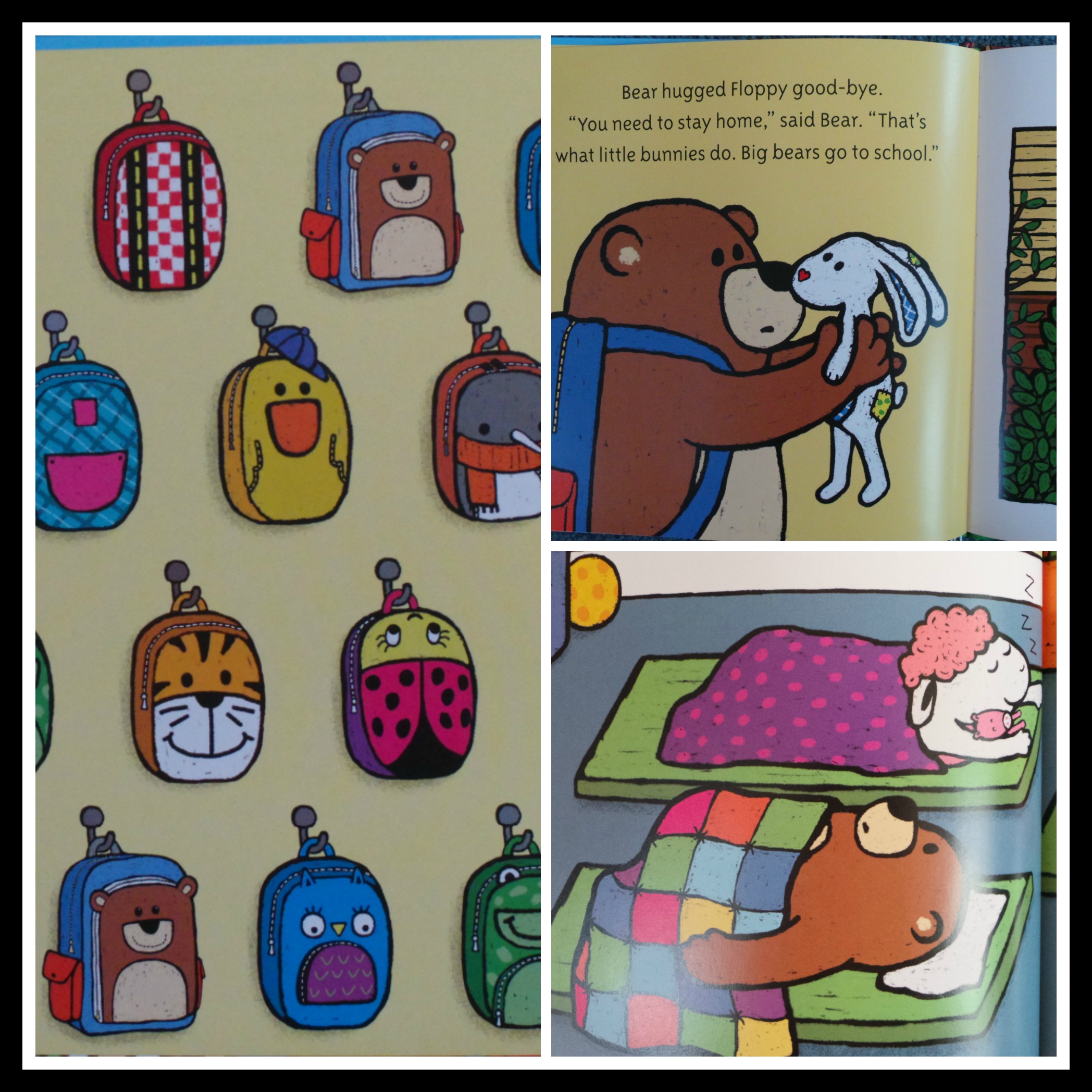 It’s here when the teacher pulls him aside and tells him that it’s OK to ask for help. Bear misses Floppy, his stuffed, toy bunny at home and asks his teacher for help. The next day Bear is able to bring Floppy to school because his teacher helped him make a pouch for his backpack to fit in. We also learn that one of his friends at school brought their stuffed animal too.