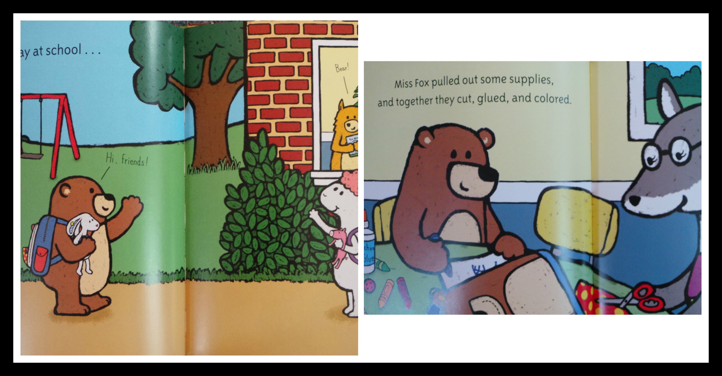 It’s here when the teacher pulls him aside and tells him that it’s OK to ask for help. Bear misses Floppy, his stuffed, toy bunny at home and asks his teacher for help. The next day Bear is able to bring Floppy to school because his teacher helped him make a pouch for his backpack to fit in.  We also learn that one of his friends at school brought their stuffed animal too.