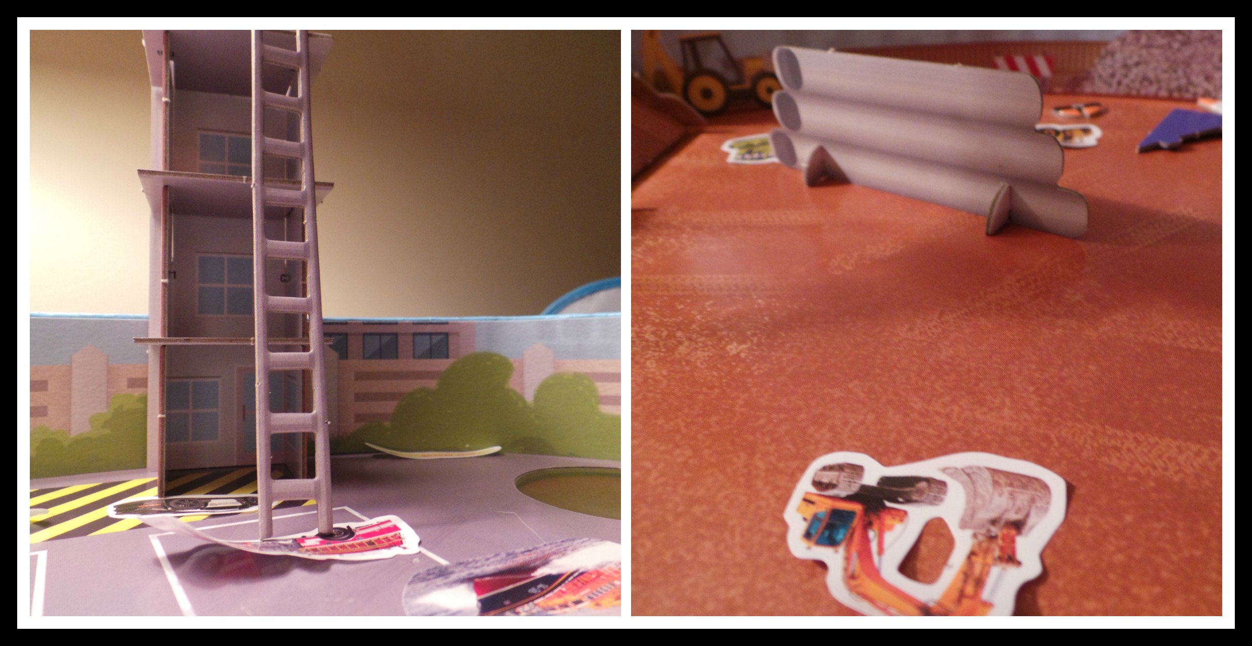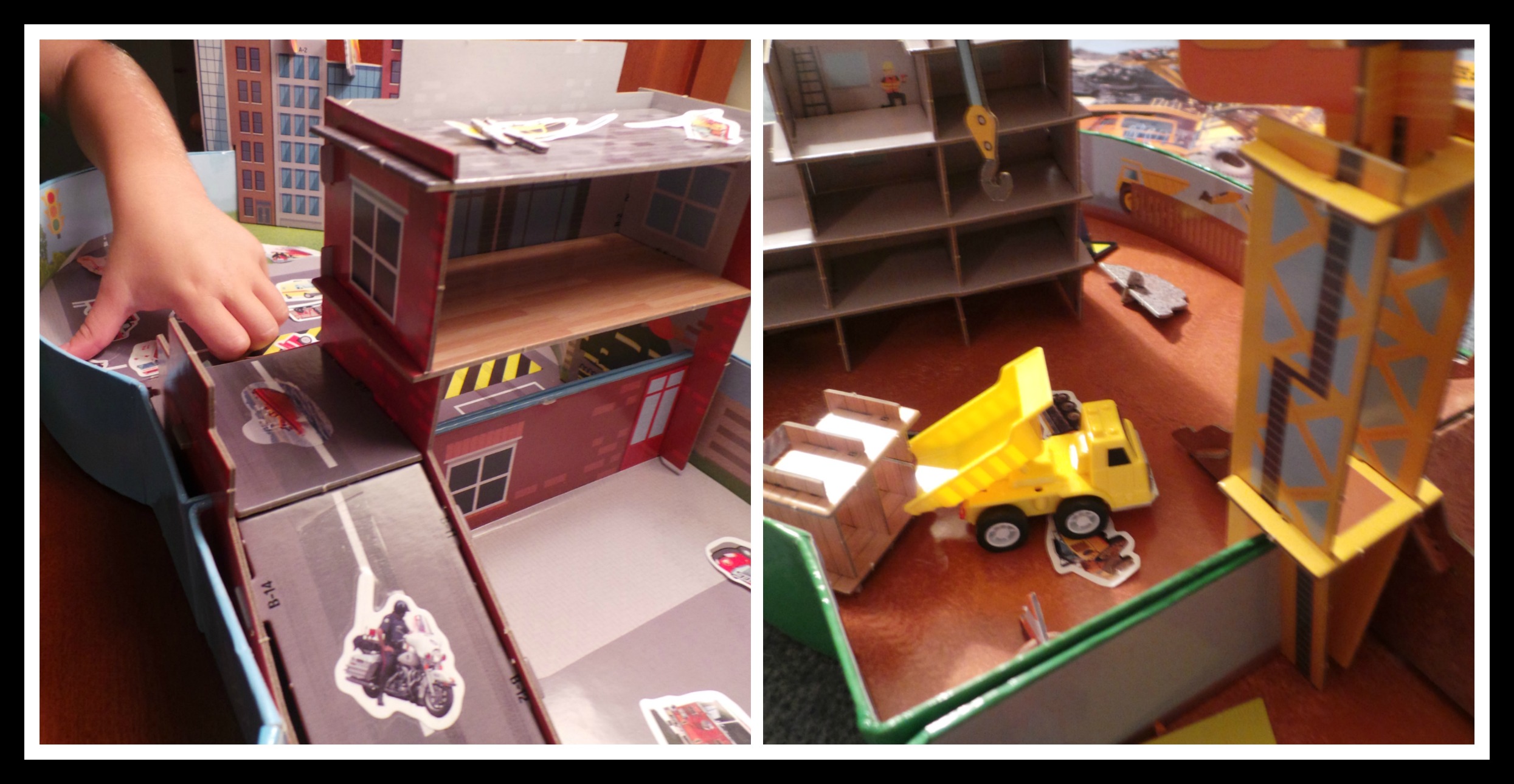 Each of these has a play area that you can build. To do this just put the open ends of the box back to back, punch out the cardboard models, assemble them and place accordingly in the box. Adults will have to assemble the play area and you might even consider gluing the pieces together to avoid your kids coming to you every five minutes after they come apart. This happened often with our youngest, who really liked the play set, but got frustrated with its construction.