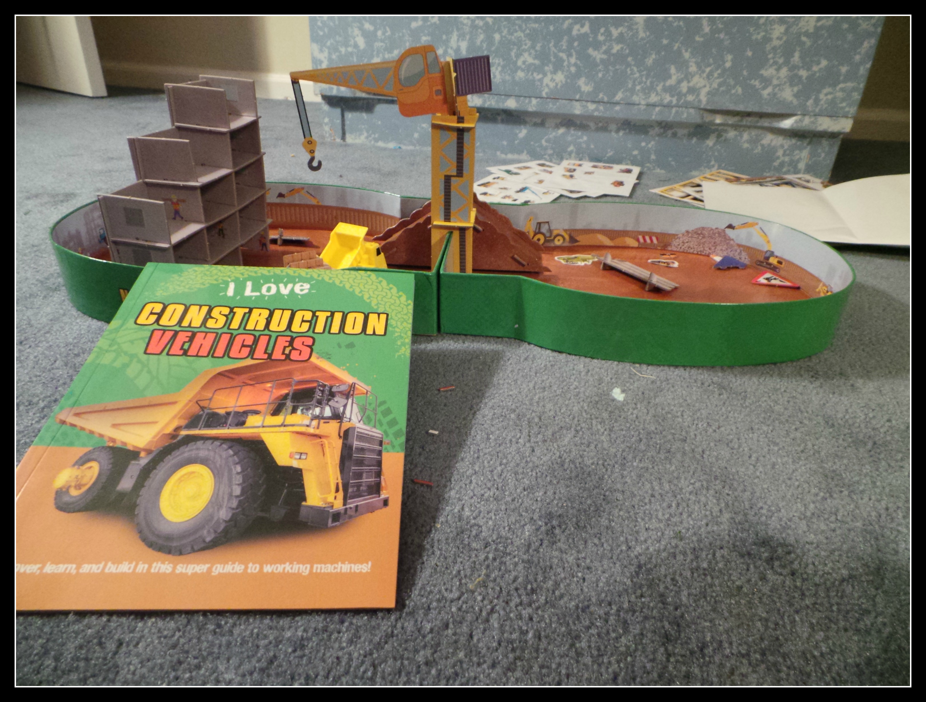 The I Love Construction Vehicles set is something that kids will like. Our almost 7 year old became tired of the play aspect of the set within a couple days. He does still like the book and put the poster up on his wall, but the enjoyment of a majority of the set faded quickly for him. The retail cost of the set is $19.99. That’s an expensive thing for a child to quickly lose interest in. If you can purchase it at half off then it’s a much more enthusiastic recommendation.