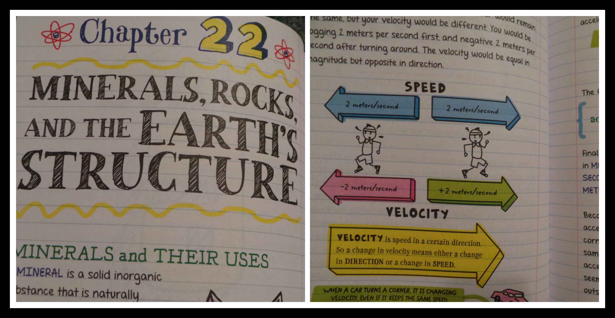 The Big Fat Notebook is fun. It’s still education, but the loose vibe of the book with its drawings and layout will keep kids at ease. The questions at the end of each chapter are printed on graph paper; the majority of the text is on ‘notebook’ paper, a la, Wimpy Kid. Each unit breaks down major concepts into small chapters and has a different colored code in the bottom right. This gives kids a nice visual queue as to how many pages are left in the current chapter.