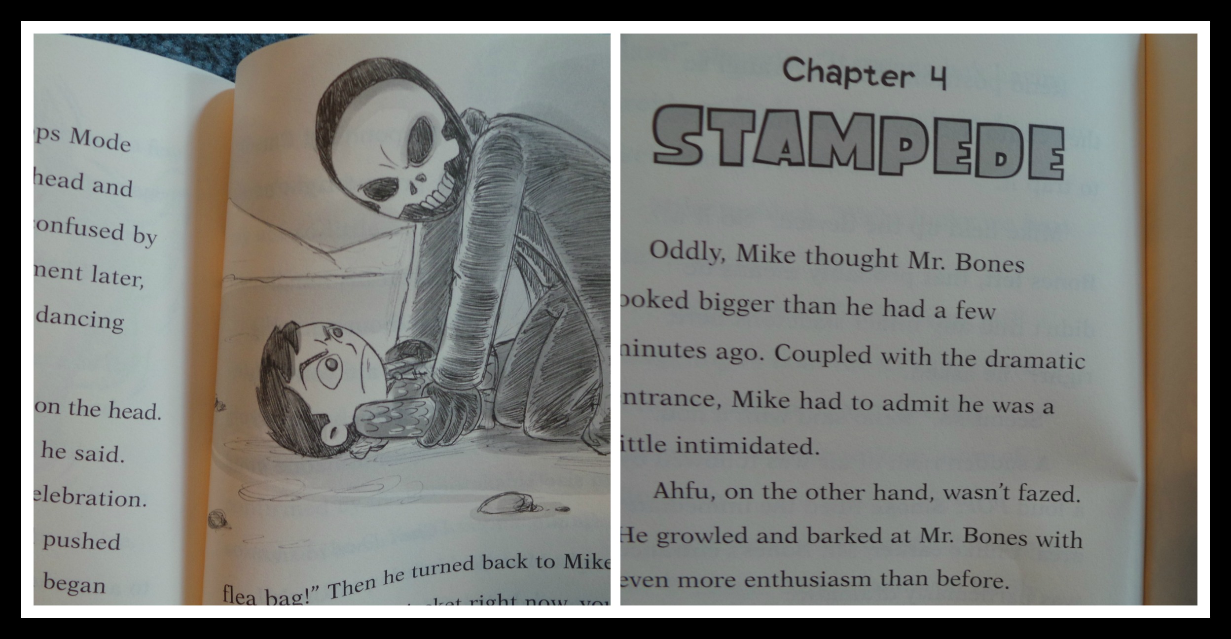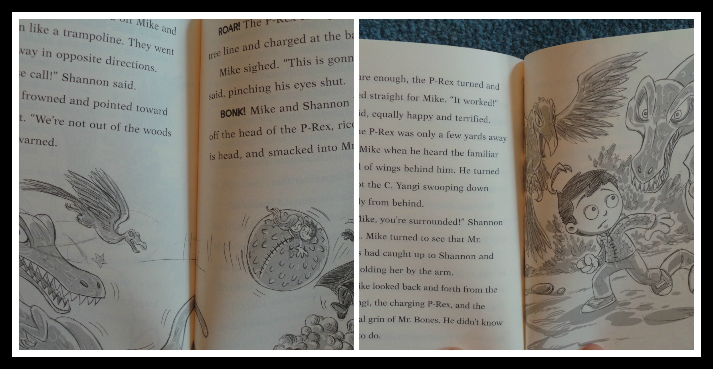 The story in the Dino-Mike books that we read are big, cover lots of plot twists and seemingly always moving. Once the story is established Mike and whoever is with him get down to chasing evil, finding bones and having fun, all the while keeping his dad in the dark about his adventures.