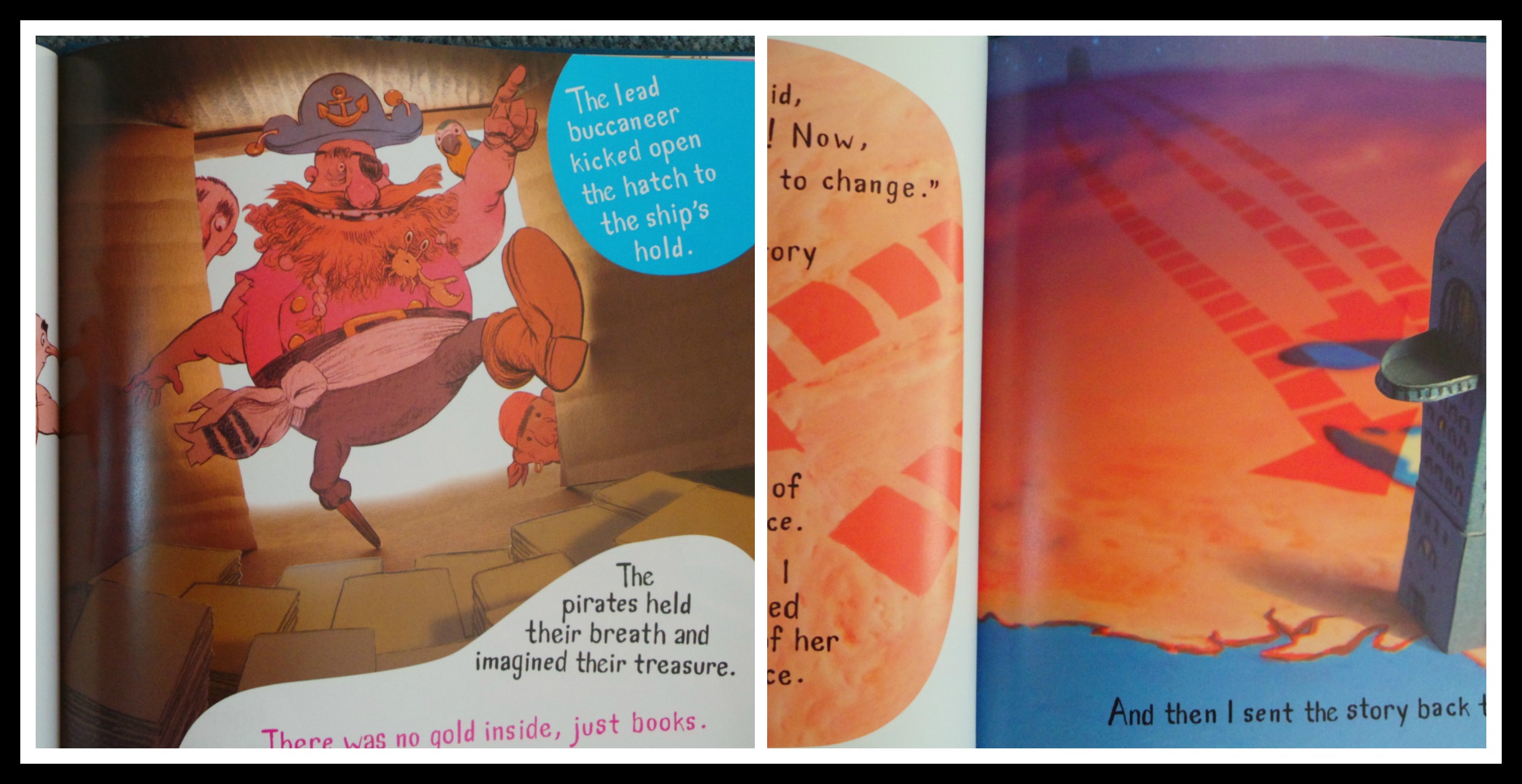 The second half focuses on the work that the illustrator did and the physical process of making it. We meet the old lady in Malaysia that runs the printing press, watch as some astronauts float around the Earth eating ice cream and looking at the massive stack of finished books that now need to be shipped back to New York. But then some pirates attack the ship that has the books, but there is no treasure, only books-so they leave.