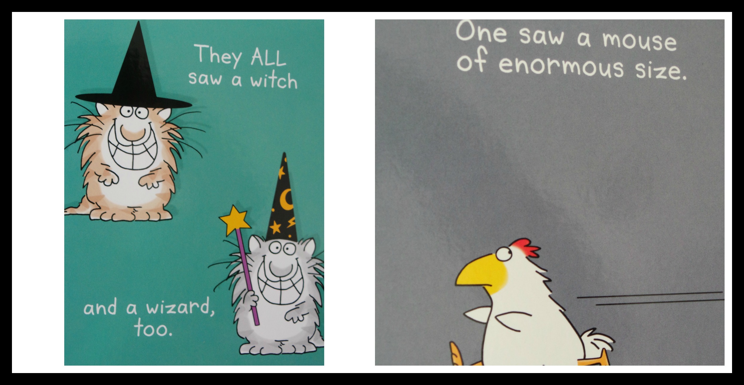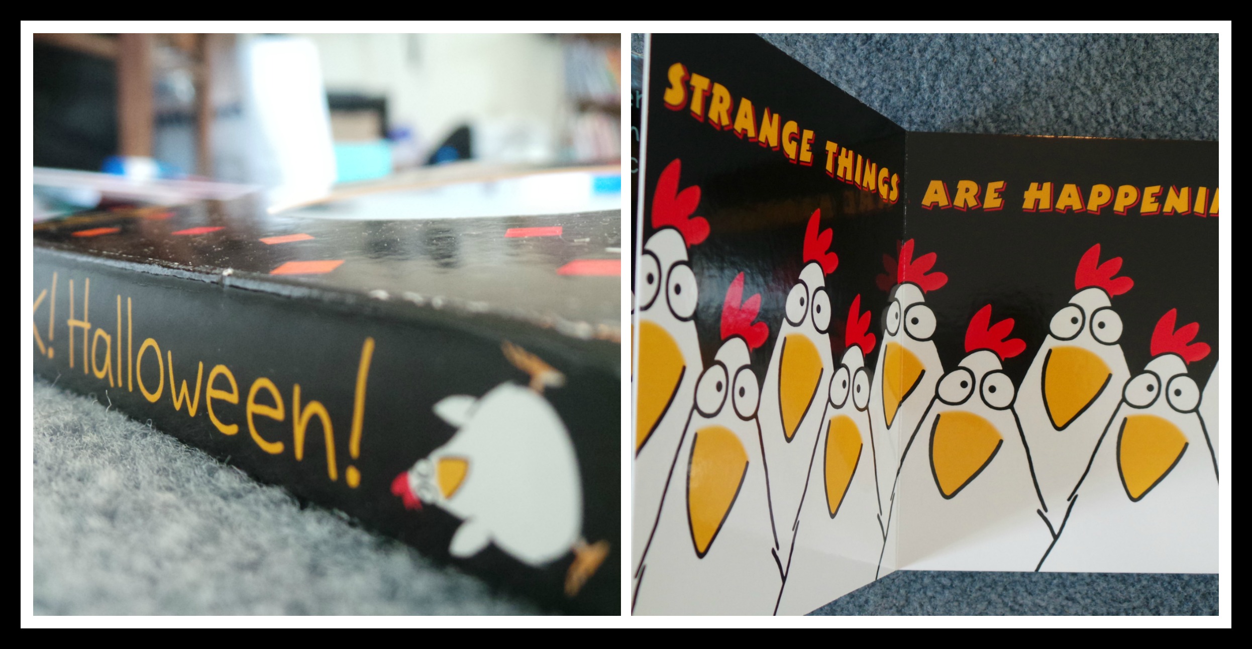 I don’t know. Even if you or your young one have never read a Sandra Boynton book before you’ll find yourself smiling whilst reading EEK! Halloween! In the end of the book children will be relieved to find out that it’s just the pig scaring the chickens. On the way to that point though they’ll be pretend scared as the chickens run from various costumed characters in a landscape of iambic pentameters.