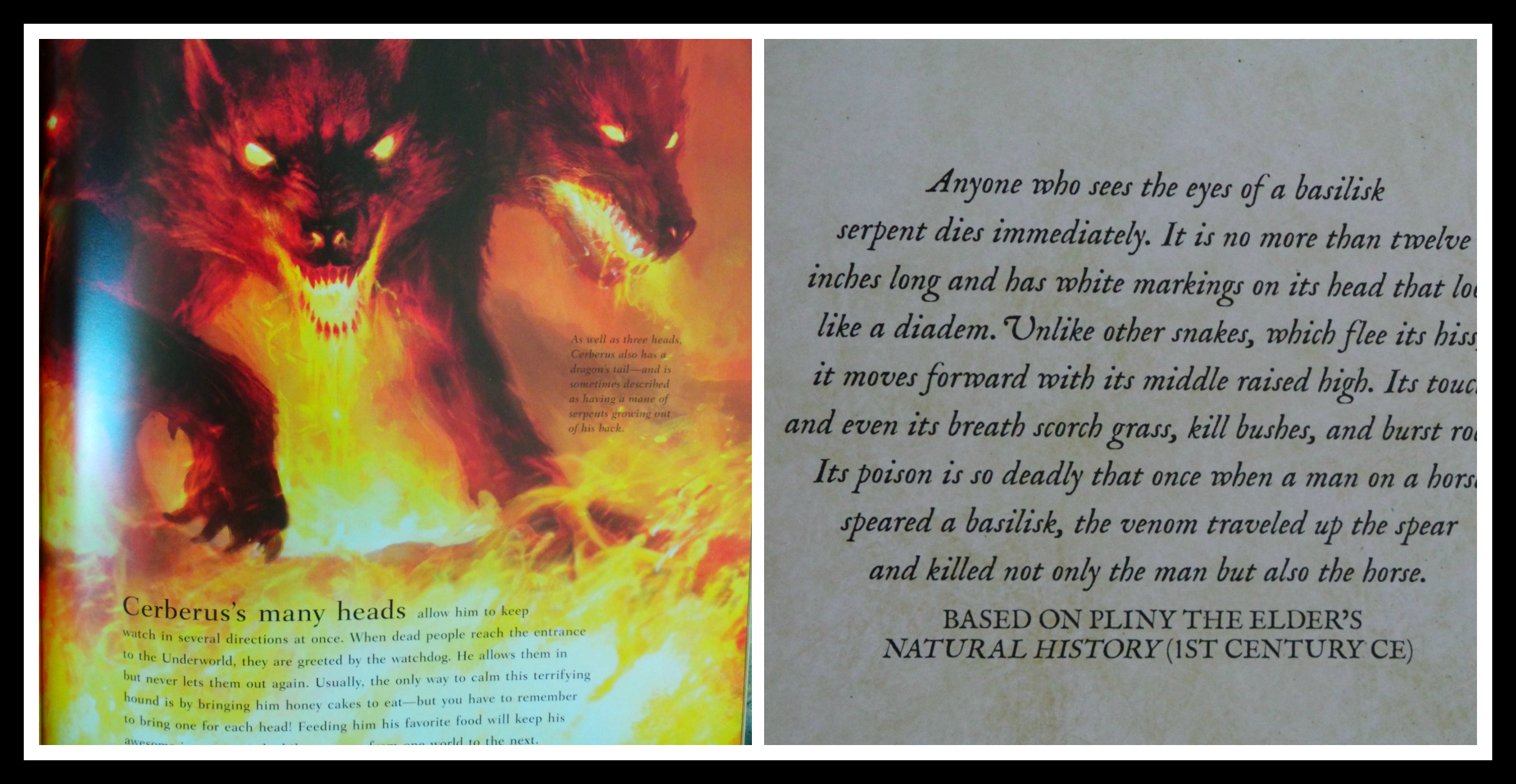 People who don’t have an interest in mythology will still be attracted to the illustrations here. There are those that you expect, like unicorns, dragons and centaurs. For me, as a casual fan of middle Earth type creatures, I enjoyed the ones that I’ve never heard of before, like basilisks, harpies, chimera, Cerberus and more.