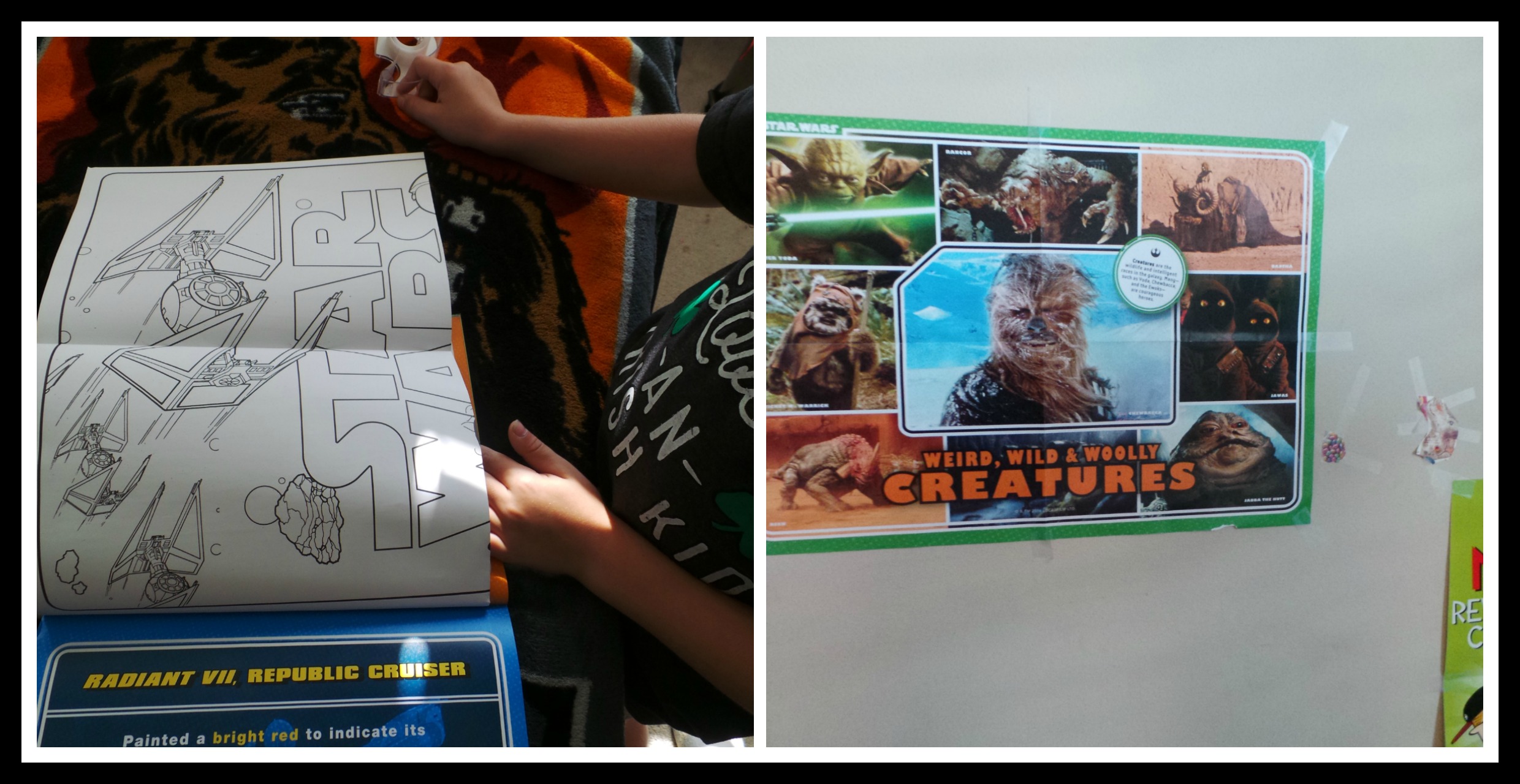 That age seems to be the prime era for kids decorating their rooms in the thing that interests them the most. We knew that our oldest was growing up when he took down his matching animal sticker activities and put up some pages from his Star Wars coloring book. Consequently, he took those pages down to give to a girl in his class that also likes Star Wars and were replaced by some of the posters from this book.