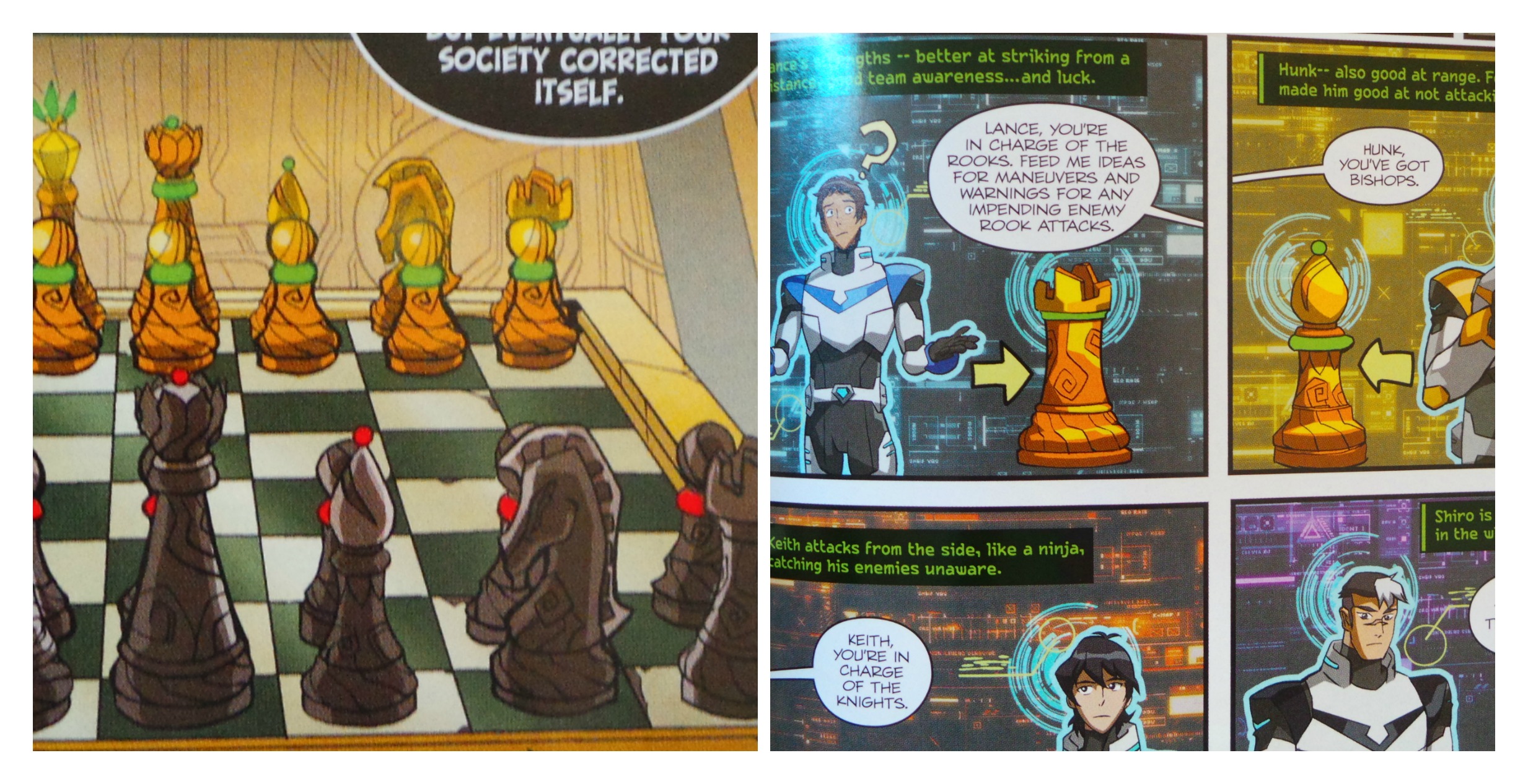 Each member of the team is assigned a chess piece, with Keith taking the knights, Lance is the rook, Hunk the bishops, Shiro the pawns and Pidge being the queen. See, they’re stronger together and can beat anything!