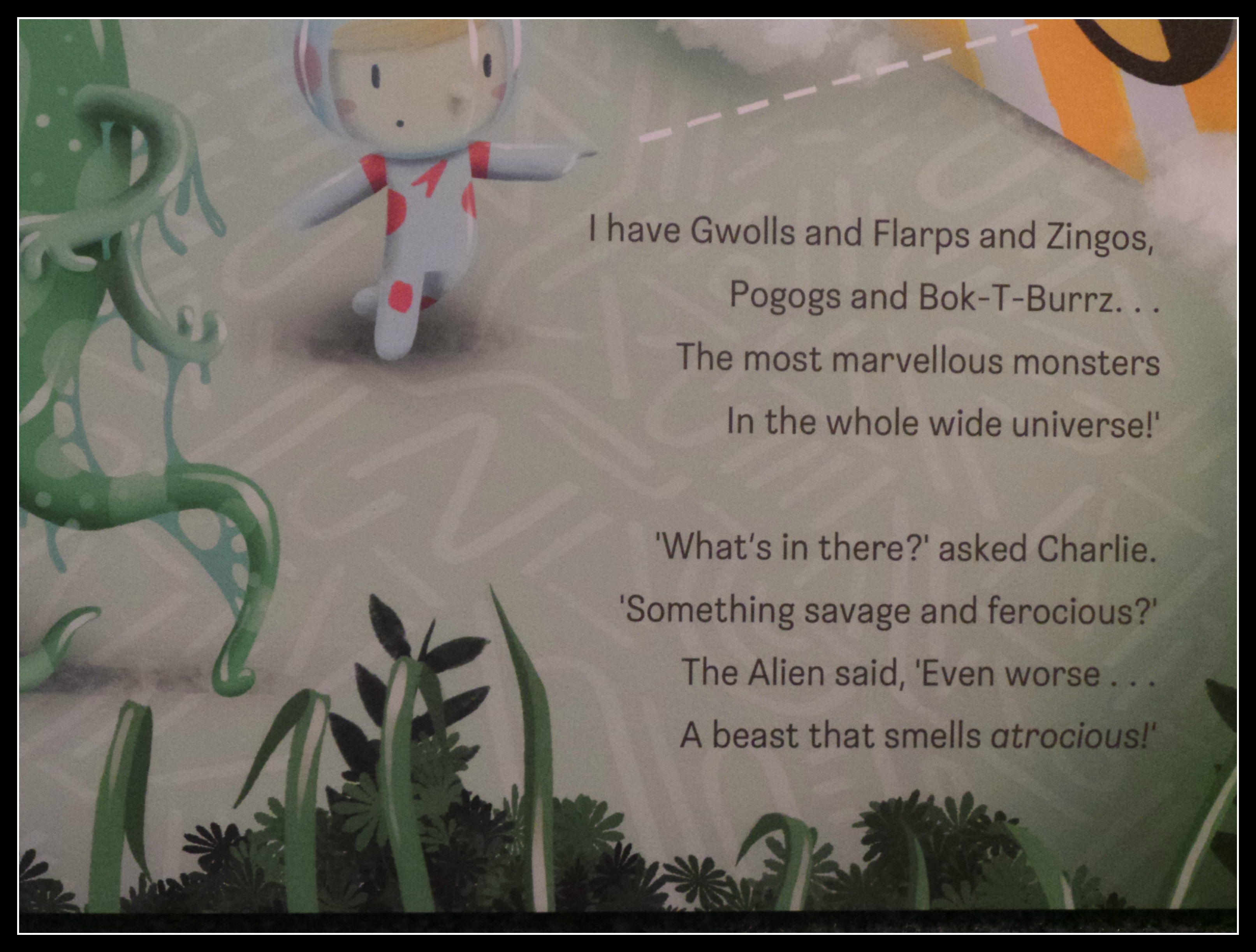 Readers also meet a good variety of aliens and animals as our protagonist (your child) travels through outer space exploring. The child is accompanied by Hubble, their robot friend who sometimes pilots the ship all the while with a cheese eating grin on his robot face.