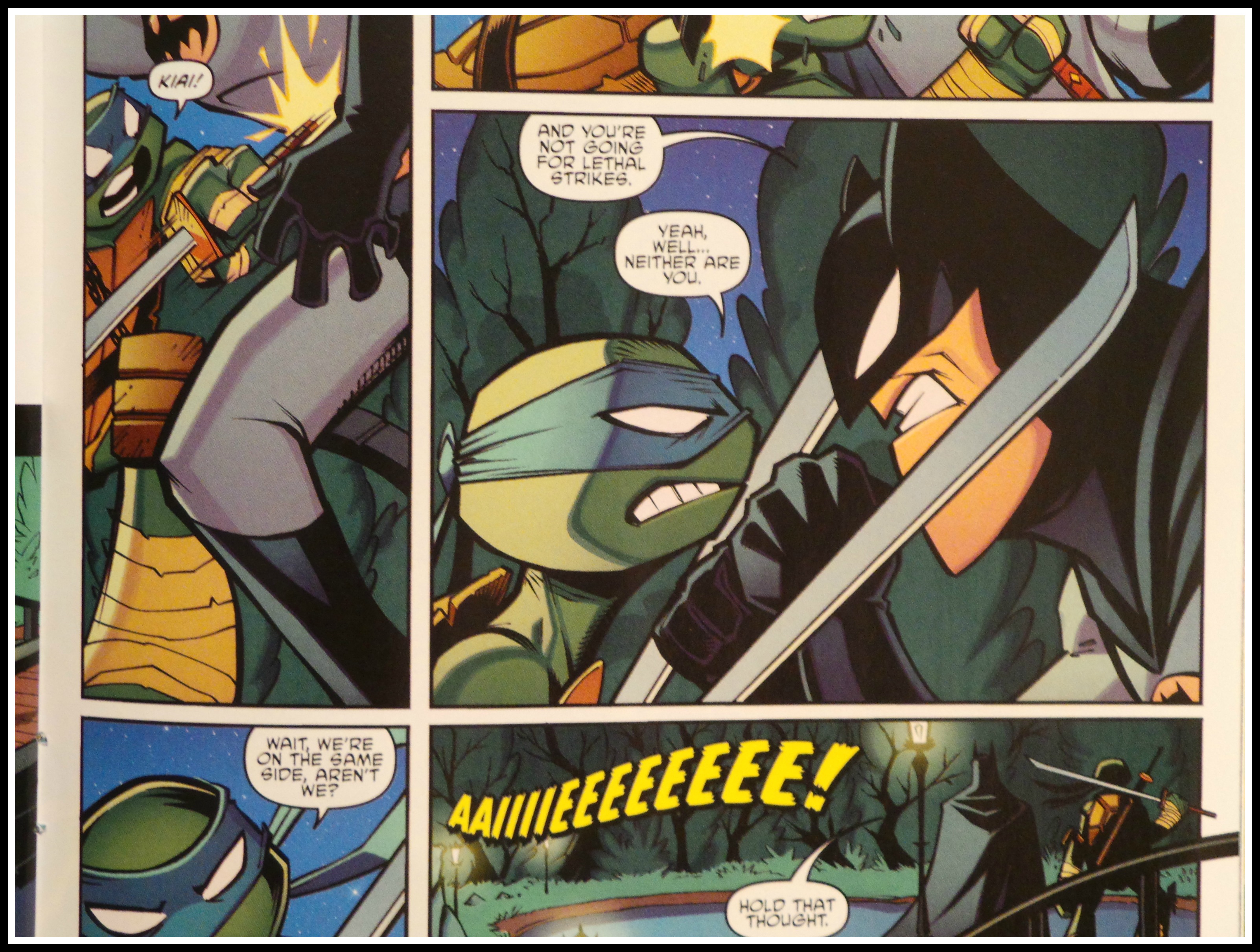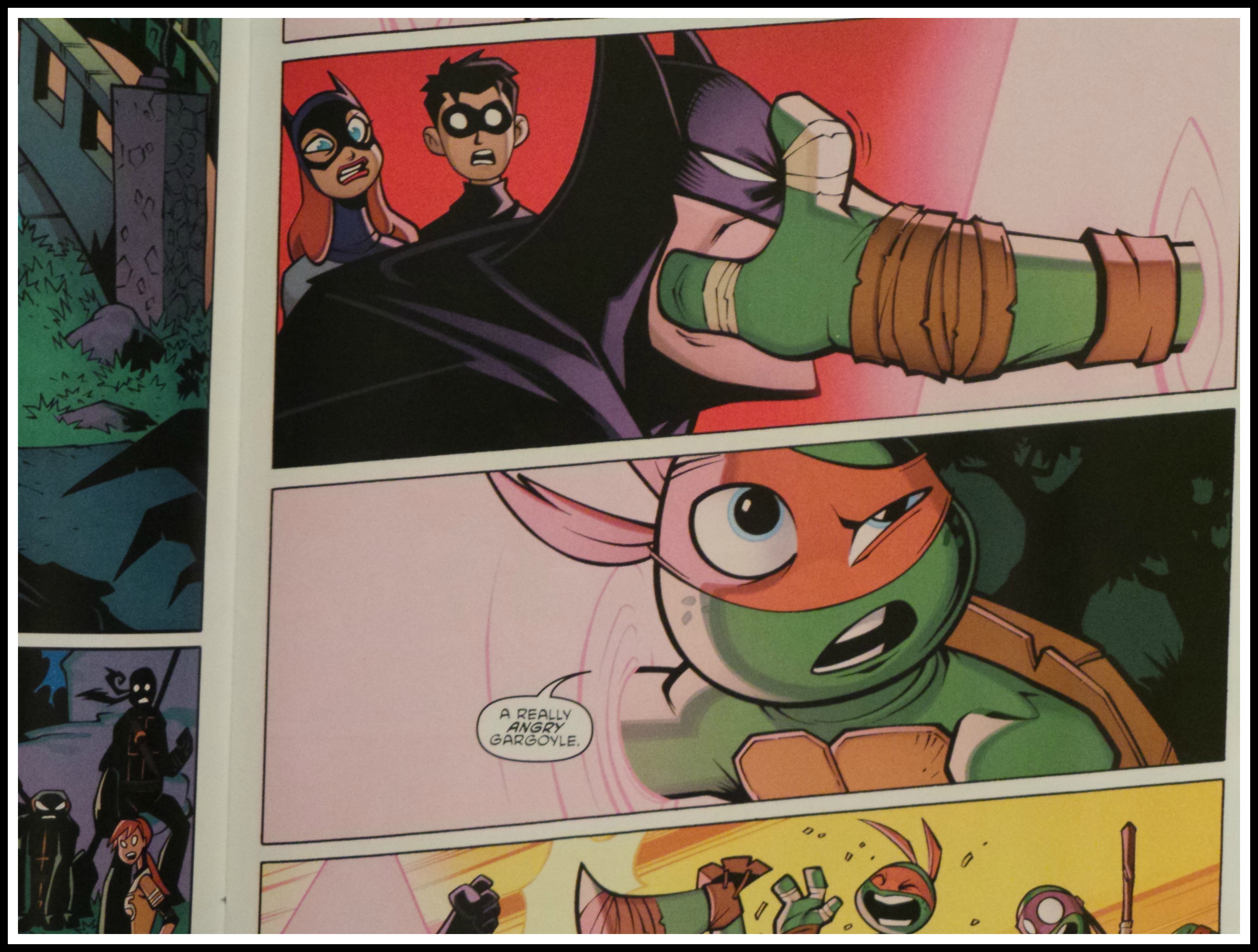 Enter Batman, Robin and Batgirl, who discover one of these portholes on top of a building and follow it to Central Park, where they are promptly discovered by the turtles. A man in a bat suit who comes out swinging makes an easy argument for a criminal, so Raphael and company shell up.