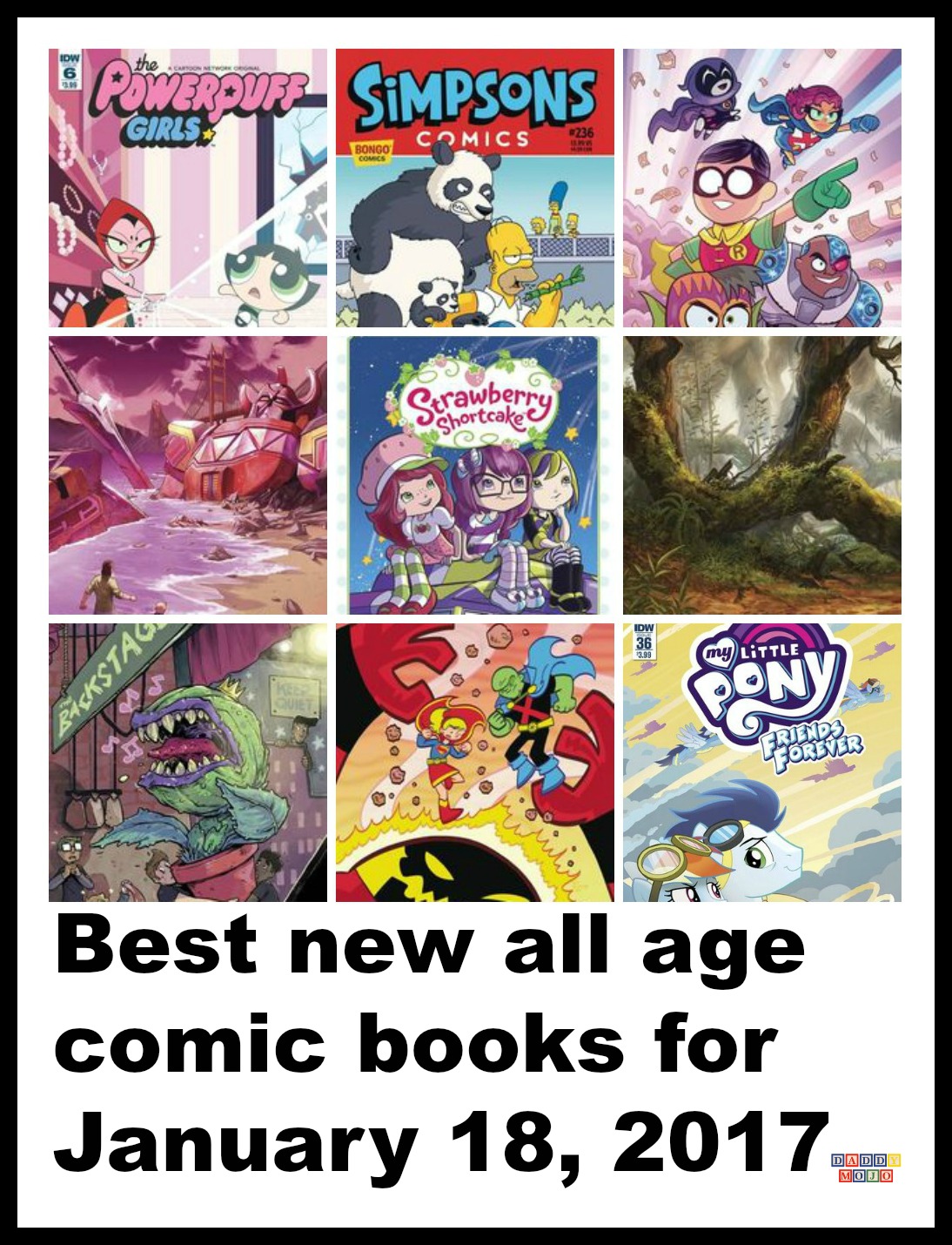 My Little Pony #36 has the Guardians of Harmony rising to protect Equestria. It brings action and just a bit of conflict to everyone’s favorite horses. These next two titles have similar age interests, but each does it with varying amounts of humor and camp. Powerpuff Girls #6 has lots of humor, camp and the most action of any of these three series. Strawberry Shortcake, HC, Volume 2 Strawberry Noir is more mysterious, with the girls deepening their friendships while trying to grow her business and more. It collects issues 3-5 of the monthly Strawberry Shortcake series on IDW. Any of those series will appeal to any girls aged 5 and up. The reading will be easiest in My Little Pony, Powerpuff Girls, followed by Strawberry Shortcake.