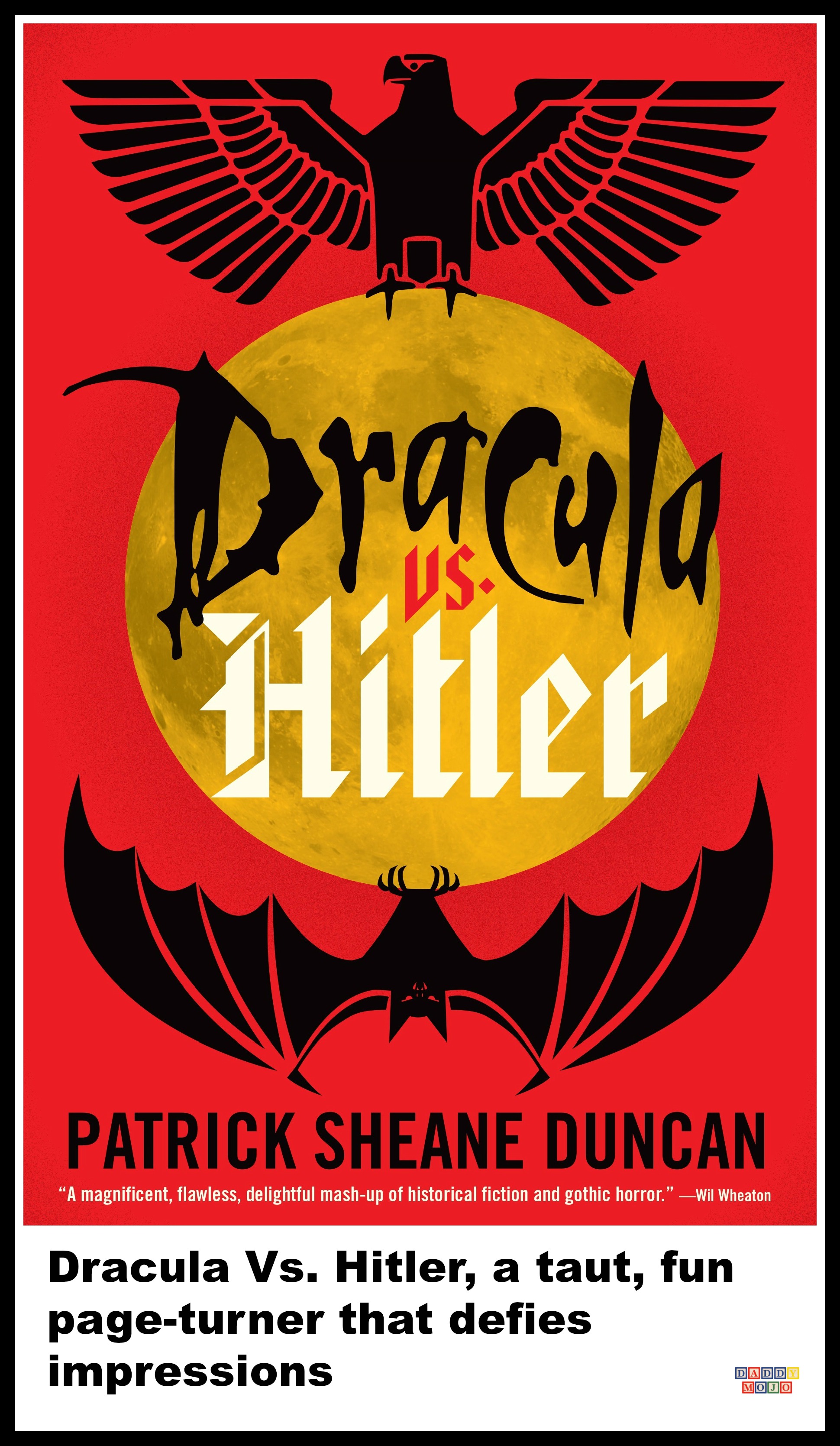 Scoff if you will. I did too when I first read the title of the book Dracula Vs. Hitler. It’s a concept and title so base and cheesy on the surface that you expect it to be a lost screenplay for a Roger Corman film. Dracula Vs. Hitler is a perfect example of the old cliché, “don’t judge a book by its cover”. From the Iron Eagle that represents the Third Reich to the upside down Vampire Bat, complete with the full moon separating them; this is a book whose imagery sets audiences up for a pulp horror version of Death wish. Instead it delivers an intelligent book with classical hooks that have more in common with great WWII dramas and its original source material than the cheesy homage that you’d expect.
