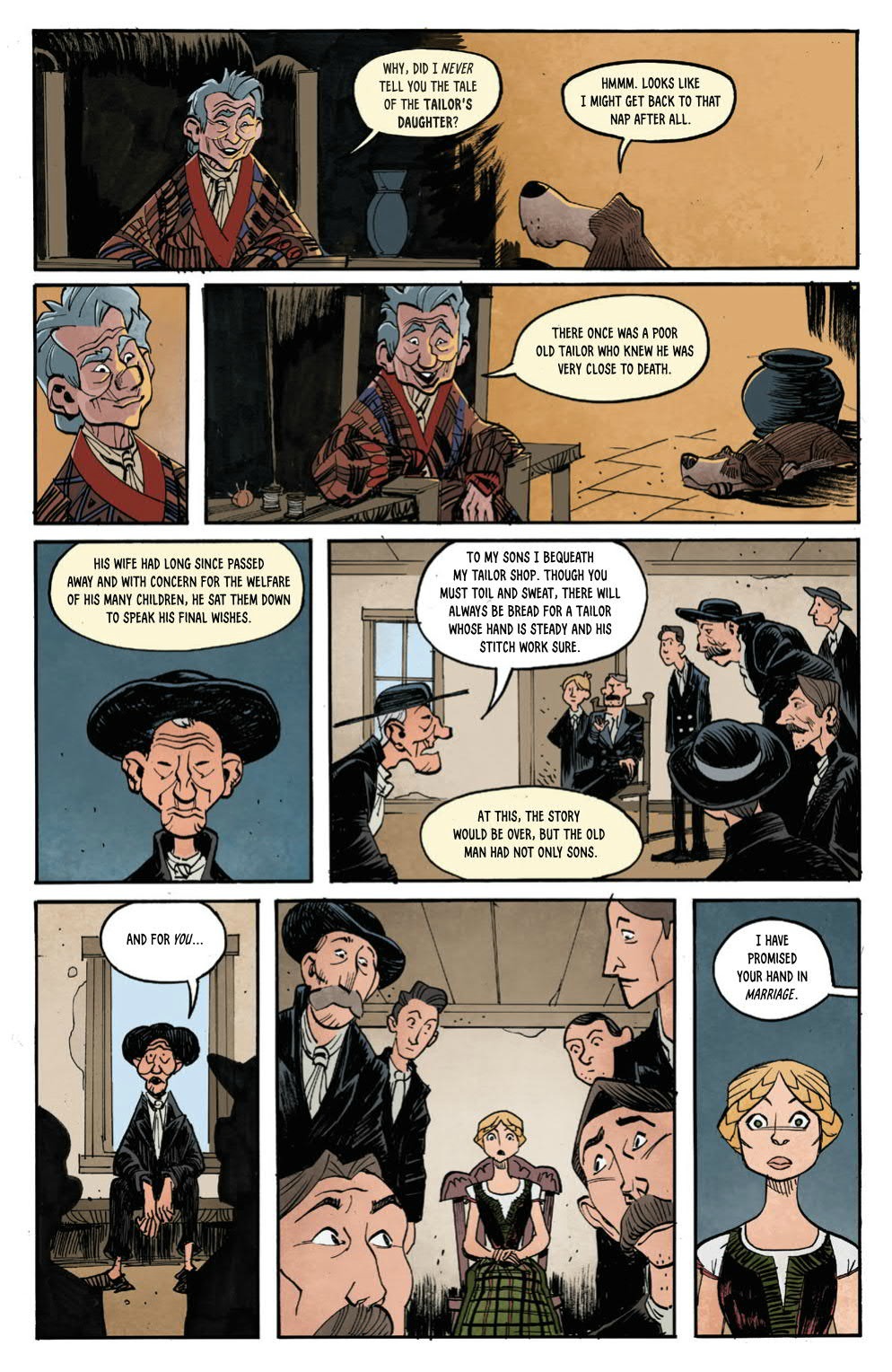 Issue 2 of The Storyteller Giants starts out as an old tailor has gathered his six sons and one daughter together to let them know about the family’s assets. As it went sometimes in fairy tales, the daughter was promised in marriage to the person who lives in the castle at the top of the mountain. The only difference in this story is that said person is a giant, at least 15 times larger than the tailor’s daughter.