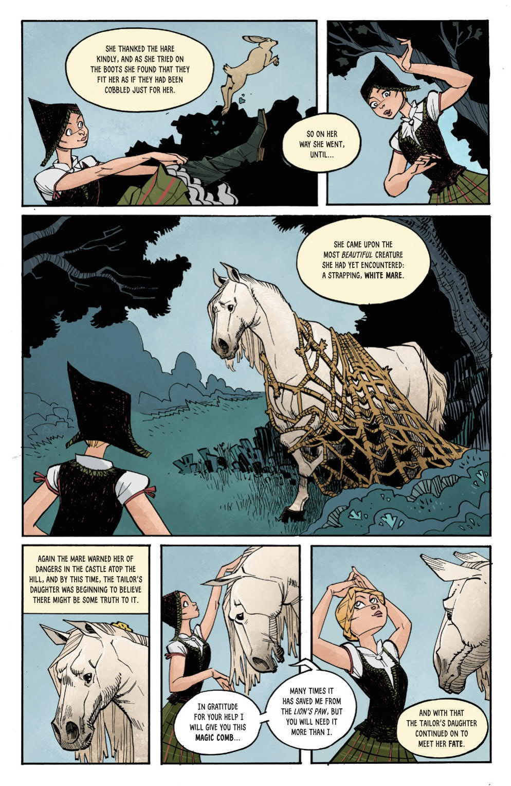 The art and story in the comic book are appropriate for any age because there isn’t any violence or bad words. However, there is lots of reading and while any age could ‘read’ the comic it will be best enjoyed by those in middle school or up. It’ll appeal equally to boys or girls due to its fairy tale framework, great art and the fact that it’s a comic book.
