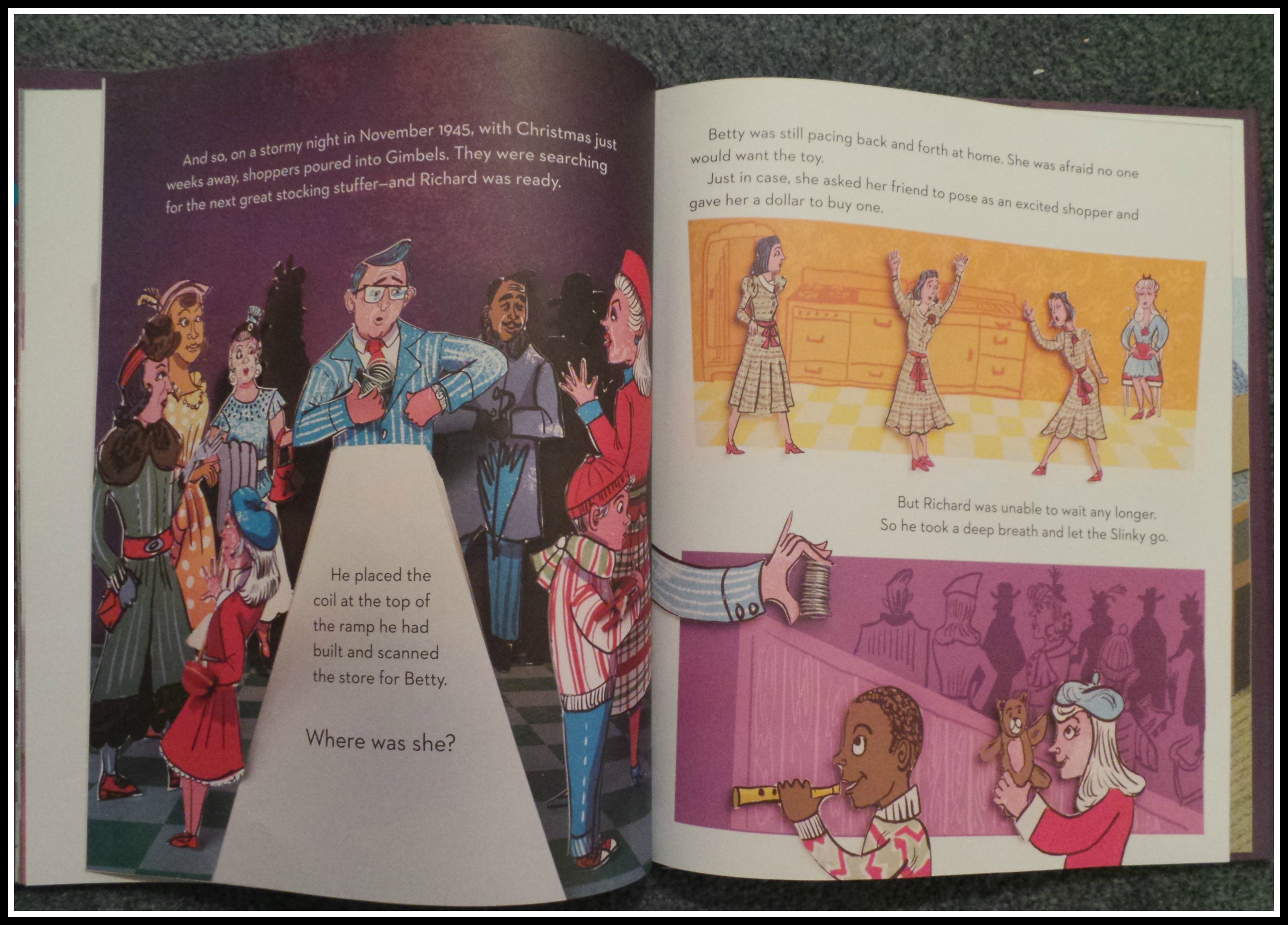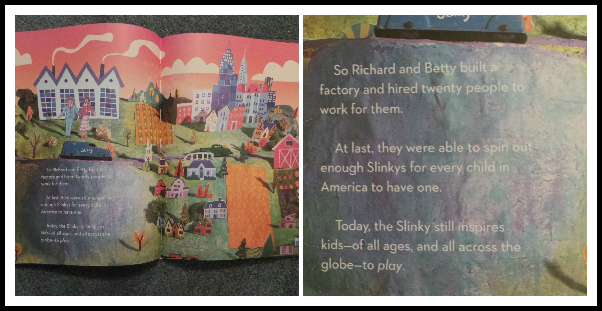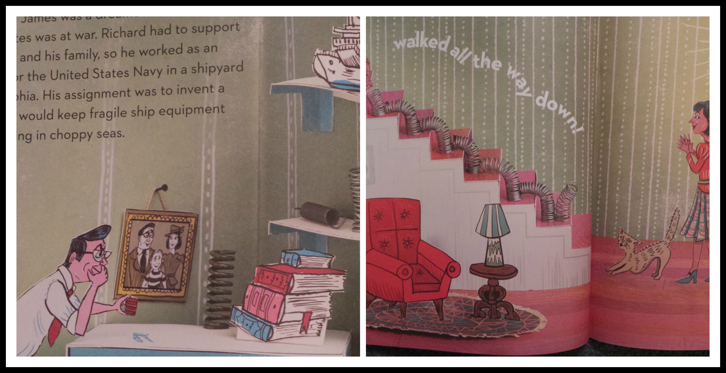 The presentation in the book is what will grab your attention first. The illustrations are a diorama combination of colored cut outs and real toy objects to tell the story of how the Slinky was accidentally discovered in 1943.
