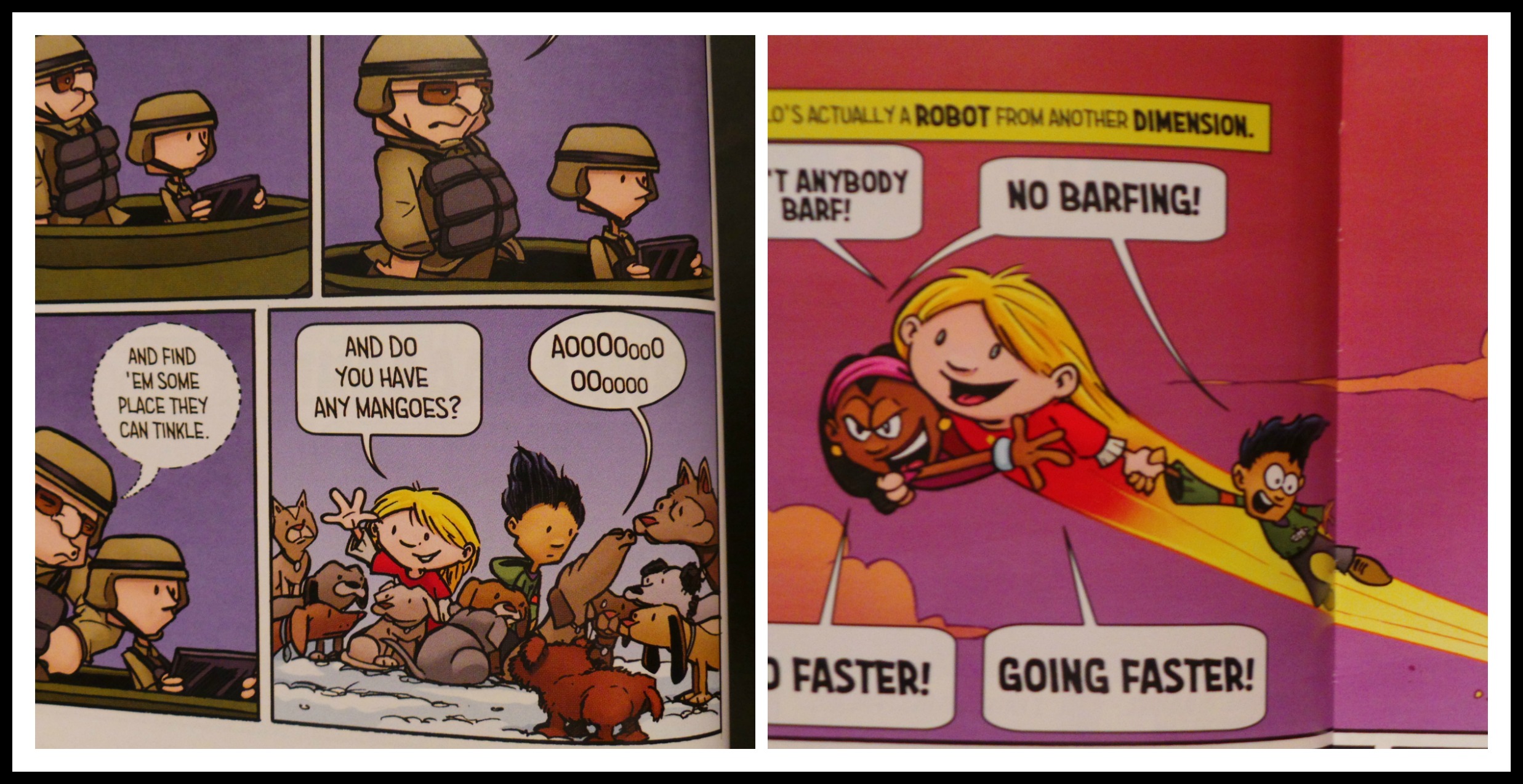 The first two inside pages of the book features a who’s-who of authors heaping praised on the Hilo books. Kids though will pay closer attention to the blurbs from their peers, like 8 year old Nate who said “I Love this book because it is exciting and funny”. Young Nate hits the nail on the head as to why anyone, but especially kids will enjoy this book.