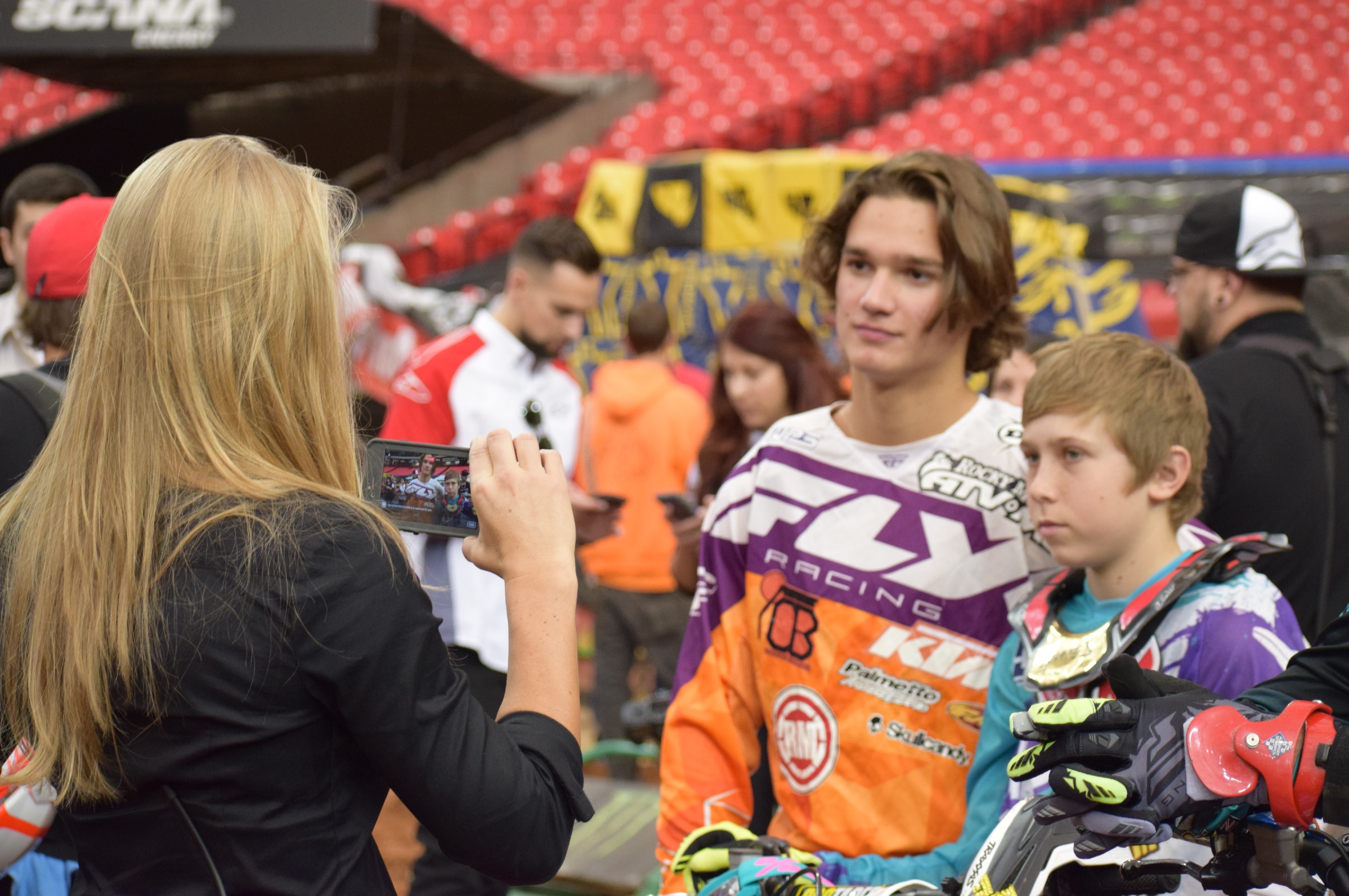 We met Justin Cooper an Arenacross racer who was there with his dad, Glen Cooper. Justin is 19 and has been doing this 15 years. As a dad who almost has panic attacks when my kids don’t wear their bike helmets it was fascinating to talk to him, his experience with the sport and how they do it.