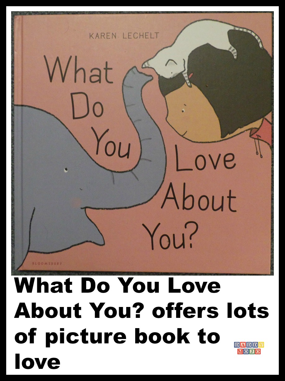 Our 5 year old has been peppering us with questions lately. “Will my skin always be this color”? “Is my tummy getting big”? and his most recent was “Why don’t you like hair”? I told him that I like hair just fine, it’s just that I don’t have any on my head. Suffice it to say he’s talking about people’s differences in pre-K and what makes everyone unique. What Do You Love About You? by Karen Lechelt is right in his sweet spot of books now.