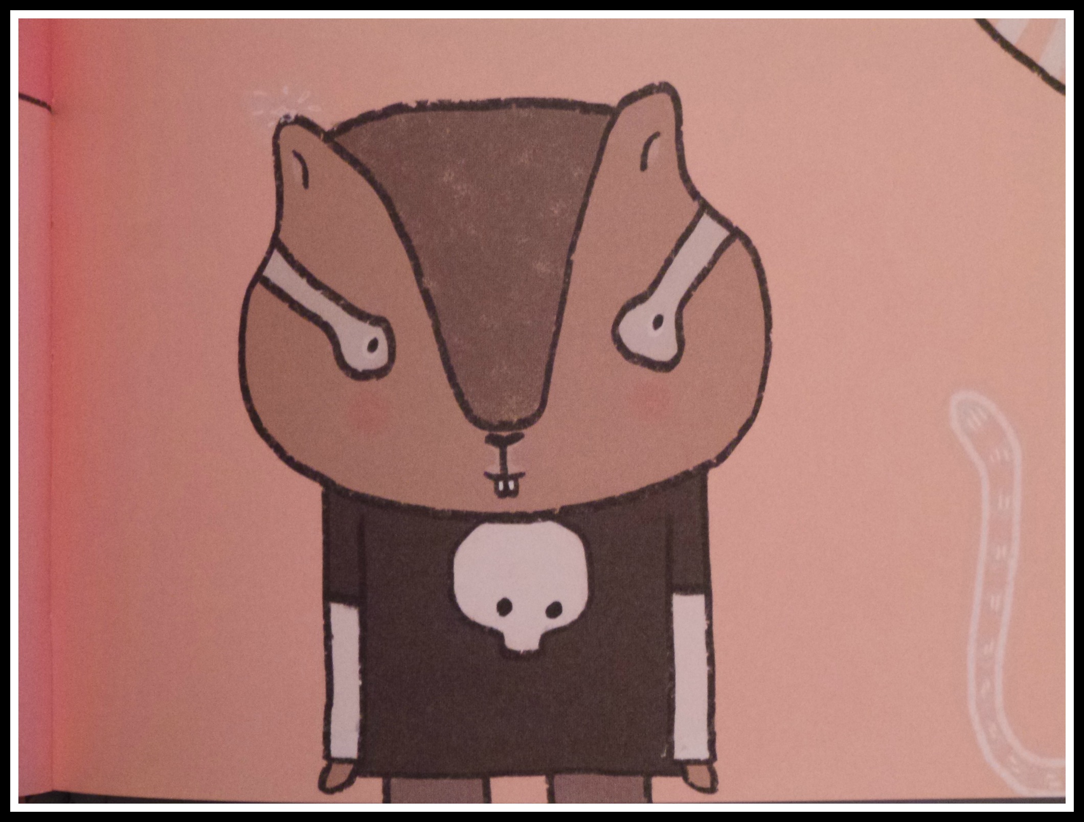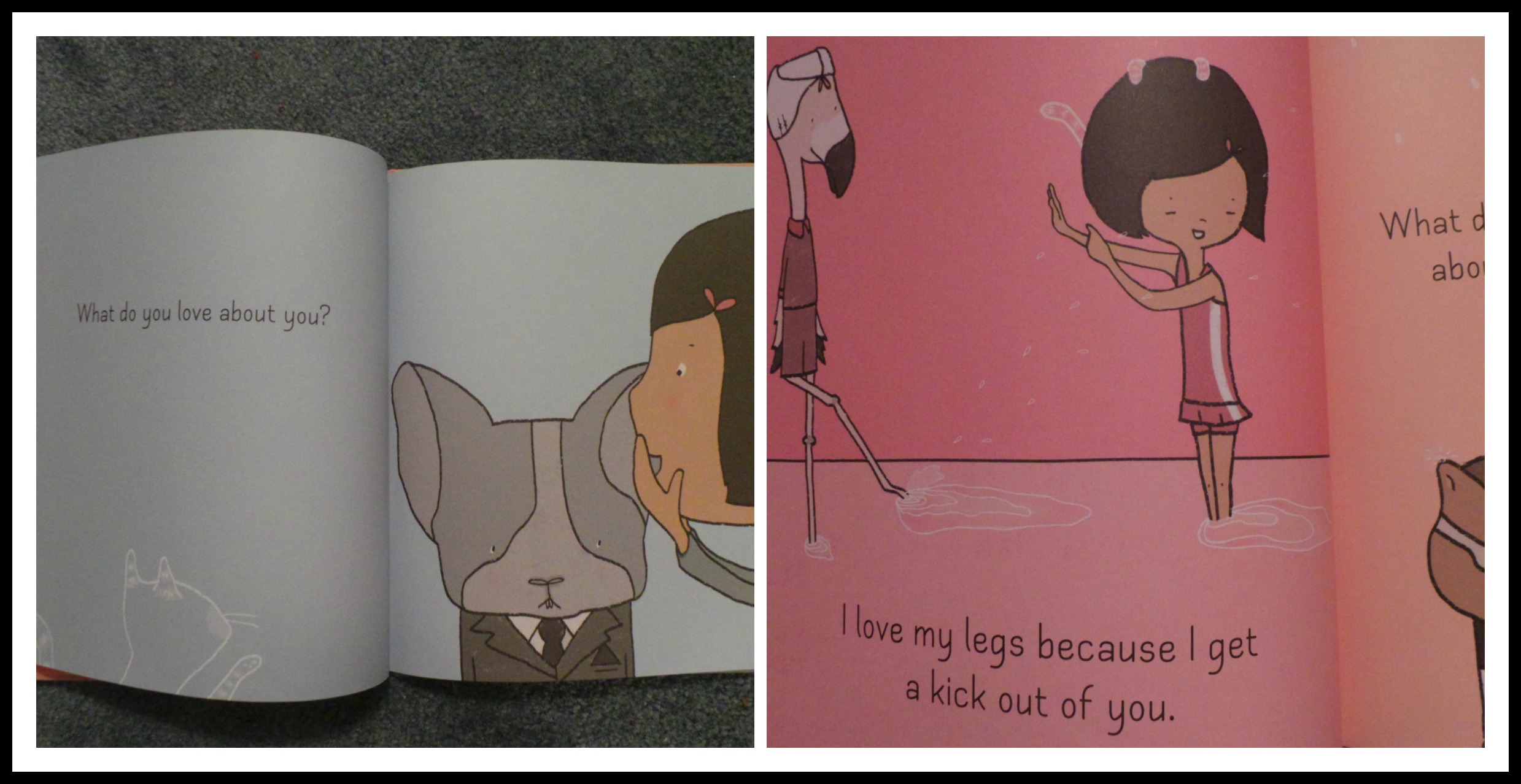 It starts out with a little girl asking a little dog in a suit what he likes about him. He likes his ears because it tickles when people whisper in his ear. The flamingo likes her long legs because she’s able to kick water. The chipmunk in the Punisher t-shirt likes his cheeks because blowing kisses is more fun that way.