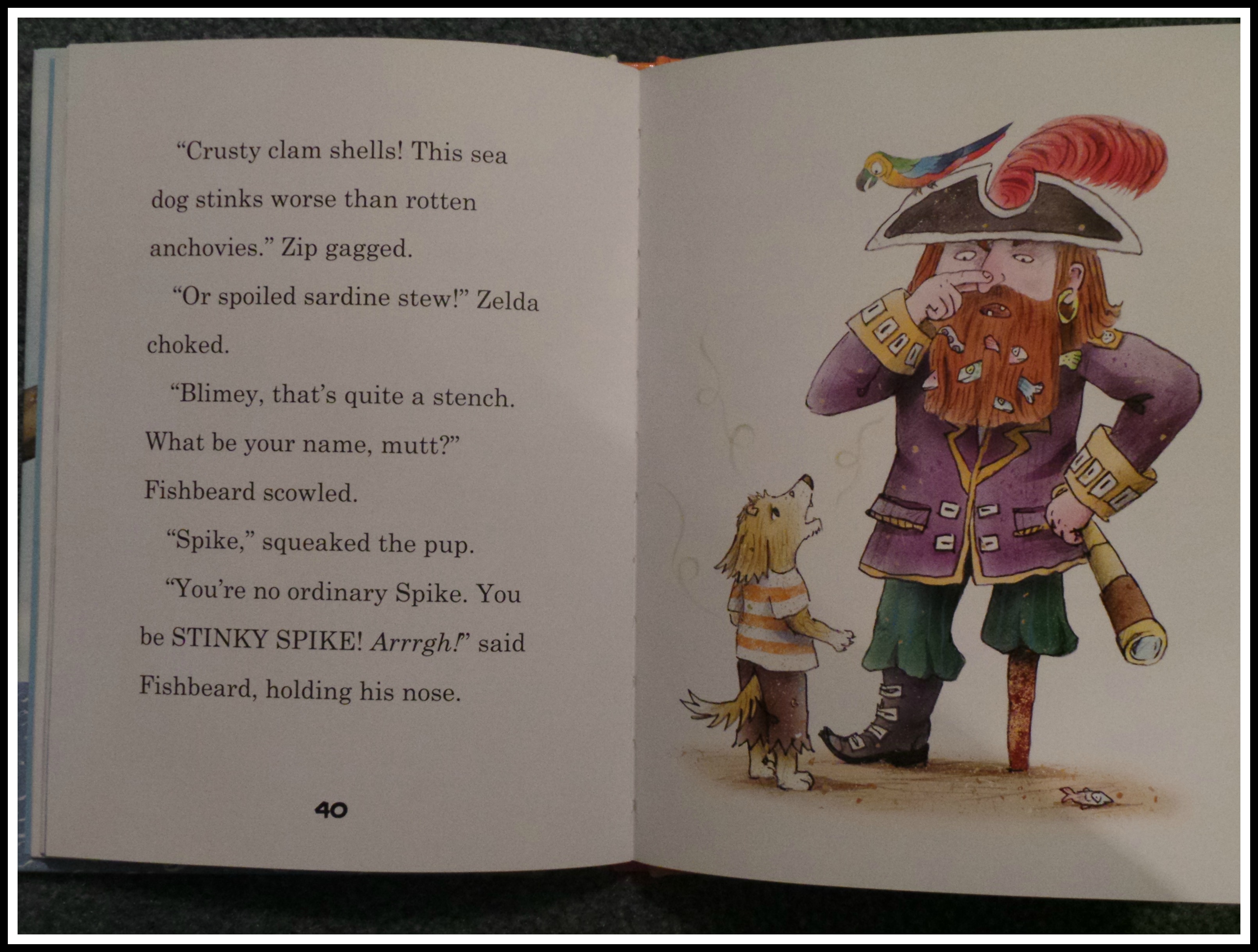 Stinky Spike is not exclusively for boys. I’ll approximate it as an 80/20 boy to girl preference. The first book is Stinky Spike, The Pirate Dog. In this one Spike is a dog that lives by the sea in a busy port with all manner of boats. Spike is known for his nose and his ability to correctly identify (usually horrible) smells. One day while sniffing around the docks he slips and is swept out to sea where he meets up with a band of pirates.