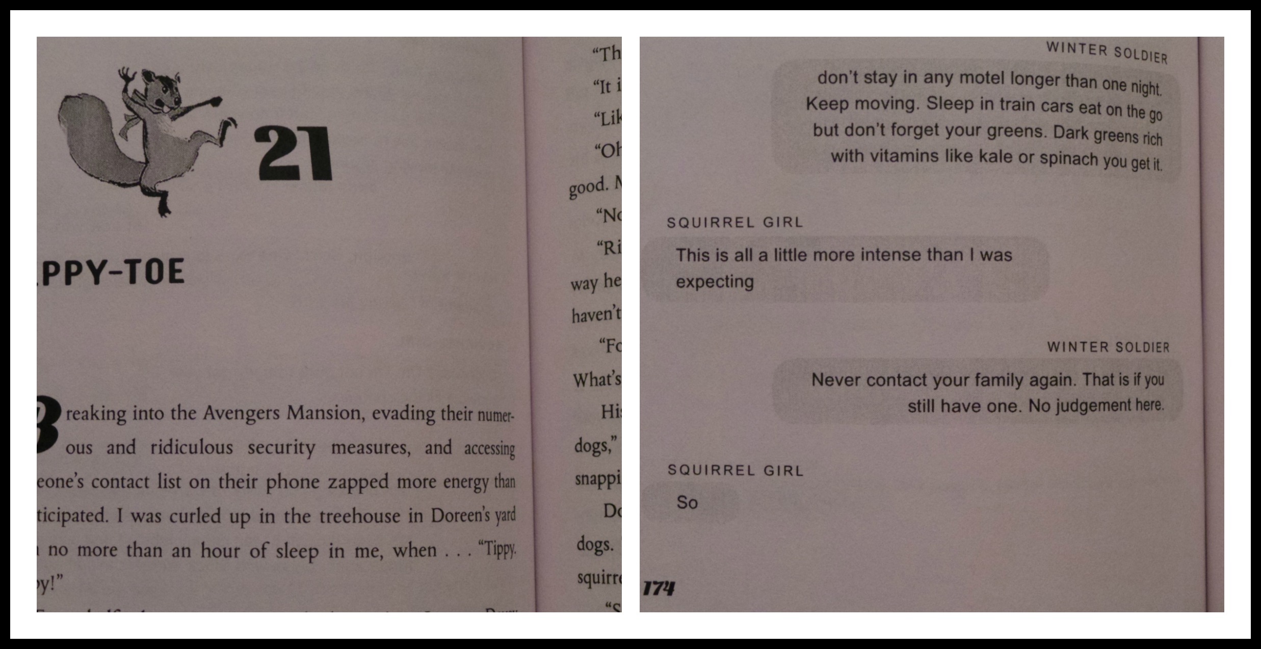 Squirrel Meets World is written in such a way that keeps readers guessing. Each chapter is about 11 pages long and several chapters are text exchanges between Squirrel Girl and various people. There is even one chapter that mainly consists of comments made on an email site that’s being run by her nemesis, the Micro Manager.