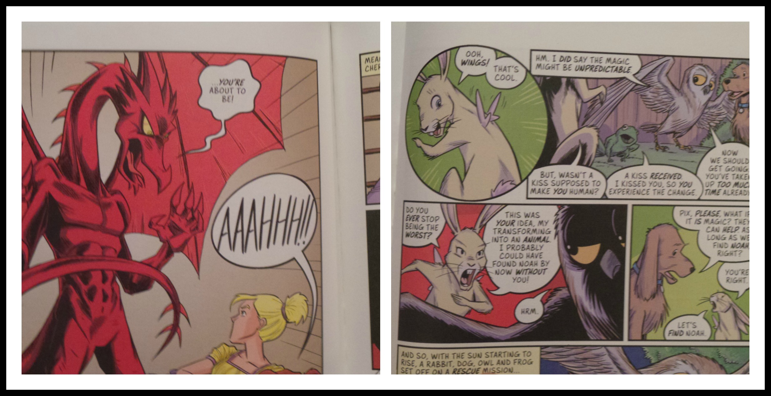 The story has its imagination wide open, just when you think Pix is a traditional super hero, she turns into a rabbit and is talking with other forest animals. She also fights a red dragon beast, saves a prince and gets shrunk down to where she can slip down the drain with ease.