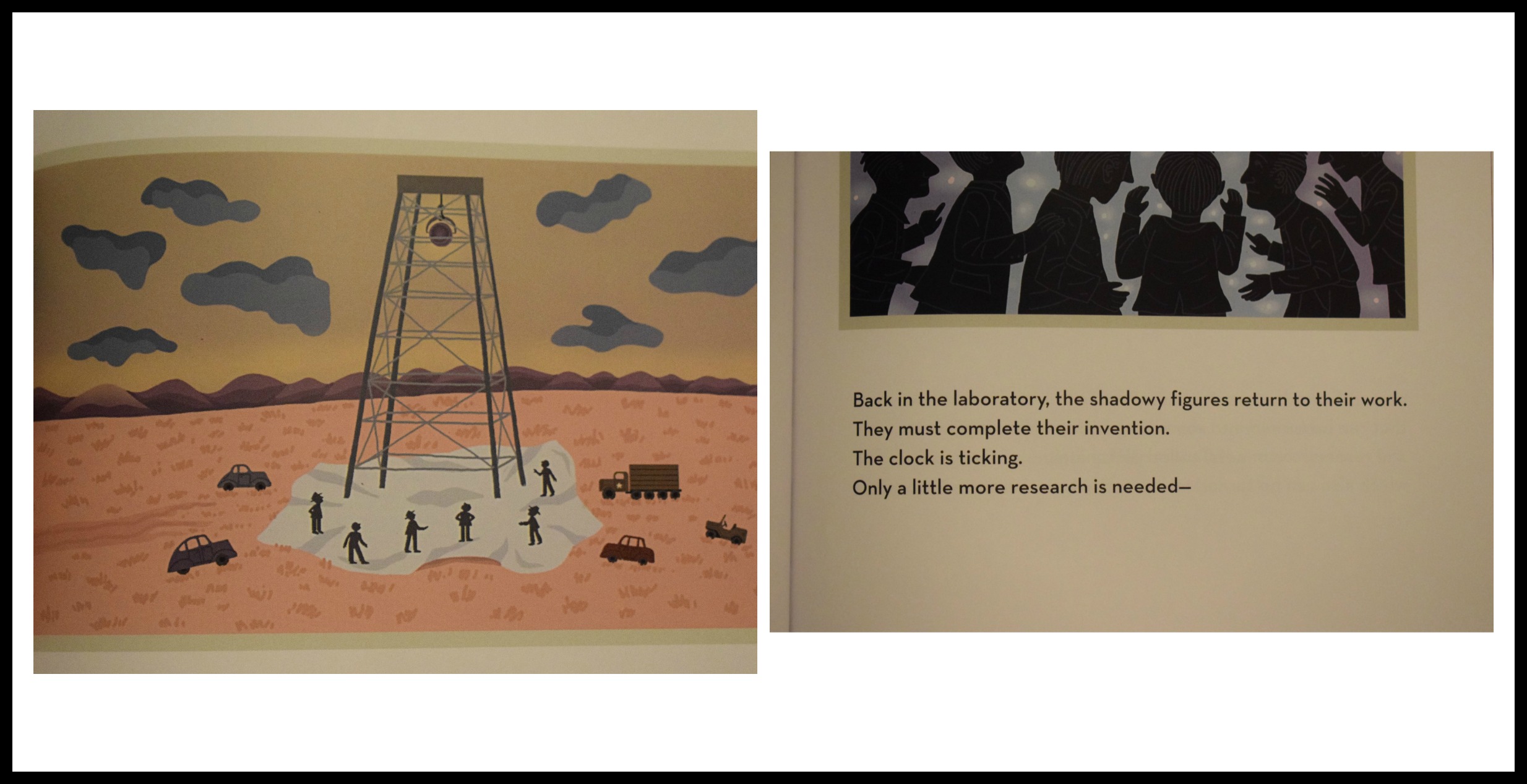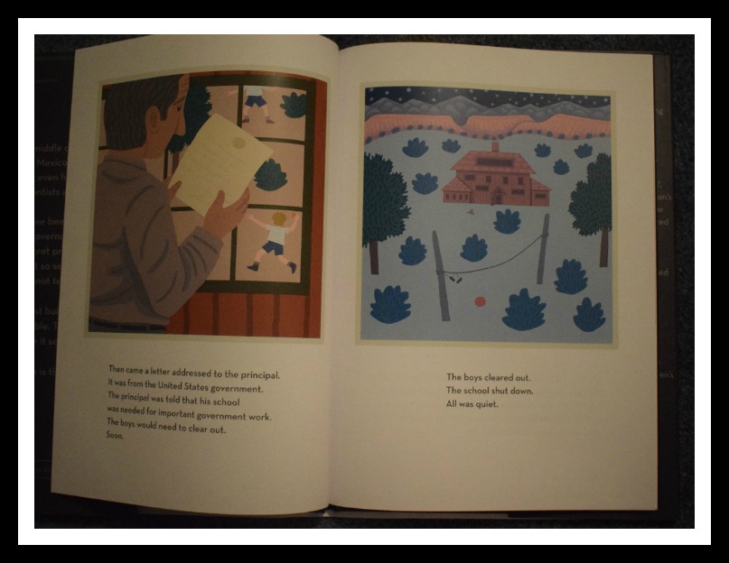 The vocabulary in The Secret Project is on par with something that third grade and up will be able to easily read. It’s presented in a way that does not glamorize the research or test, but does let young readers know that what they were doing was special and ground breaking. Each page has illustrations that are drawn with a south western feel that tell the story of the researchers, the secrecy, how they lived and the ultimate preparations that went into testing the bomb on The Trinity Test on July 16, 1945.