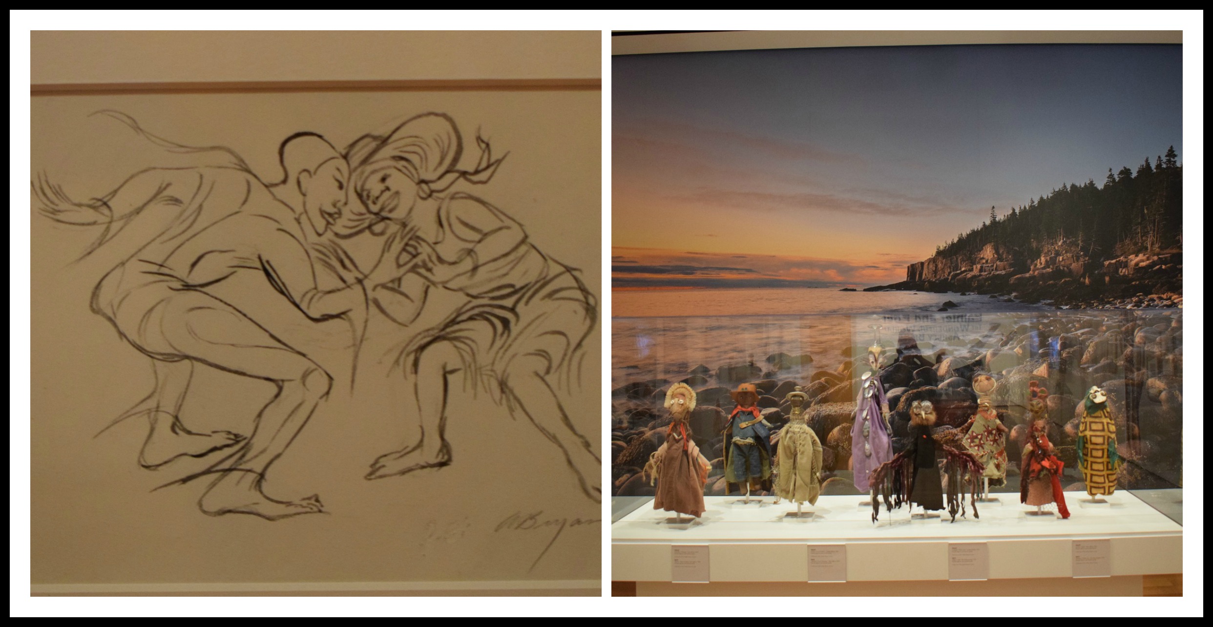 For me the high point of The Wonderful World of Ashley Bryan was the puppets that Brown made in his workshop. He made them by finding bits and pieces of things along the Maine coast, near his house. On beach walks he would find little things like buttons, coconuts, string, shells or anything else that struck his creative fancy. Pay attention as you walk through the exhibit to the reading area. You’ll see a couple baskets of his children’s book, in addition to some enlarged photographs on the wall. Some of the puppets that you just saw can be seen when they were in the development stage.