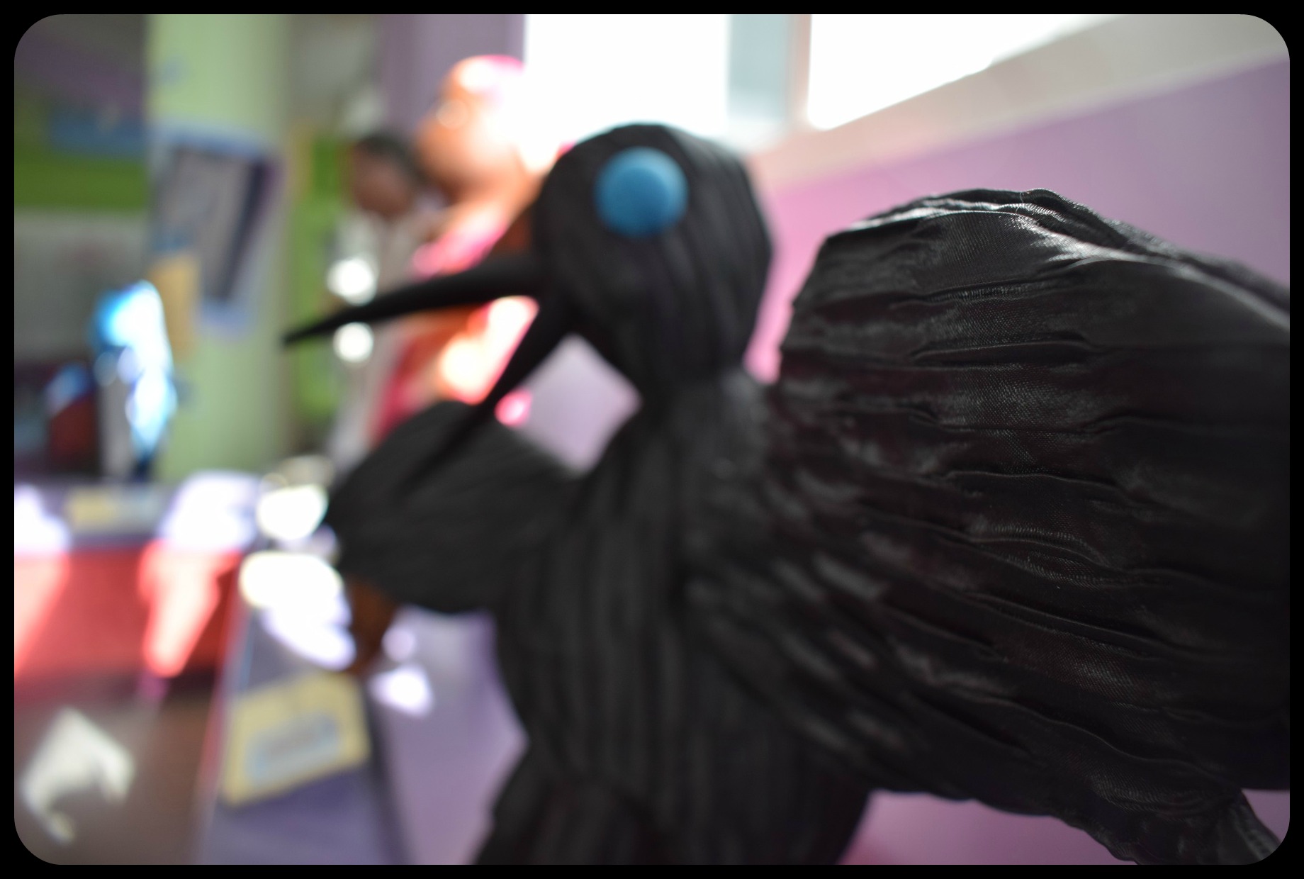 Some of his other works are cut out pieces of paper. These are animals or silhouettes that are cut out or layered to an incredibly level of detail.  Some of his other works are paintings, but his style and representation of African American characters are consistent throughout his work. When you take children to The Wonderful World of Ashley Brown be sure to point out the variety that goes into his methods. Our children liked that fact that he had a consistent style, despite not creating in the same medium. To make things even more interactive Center for Puppetry Arts made some puppets based on Bryan’s art, that kids can actually use.