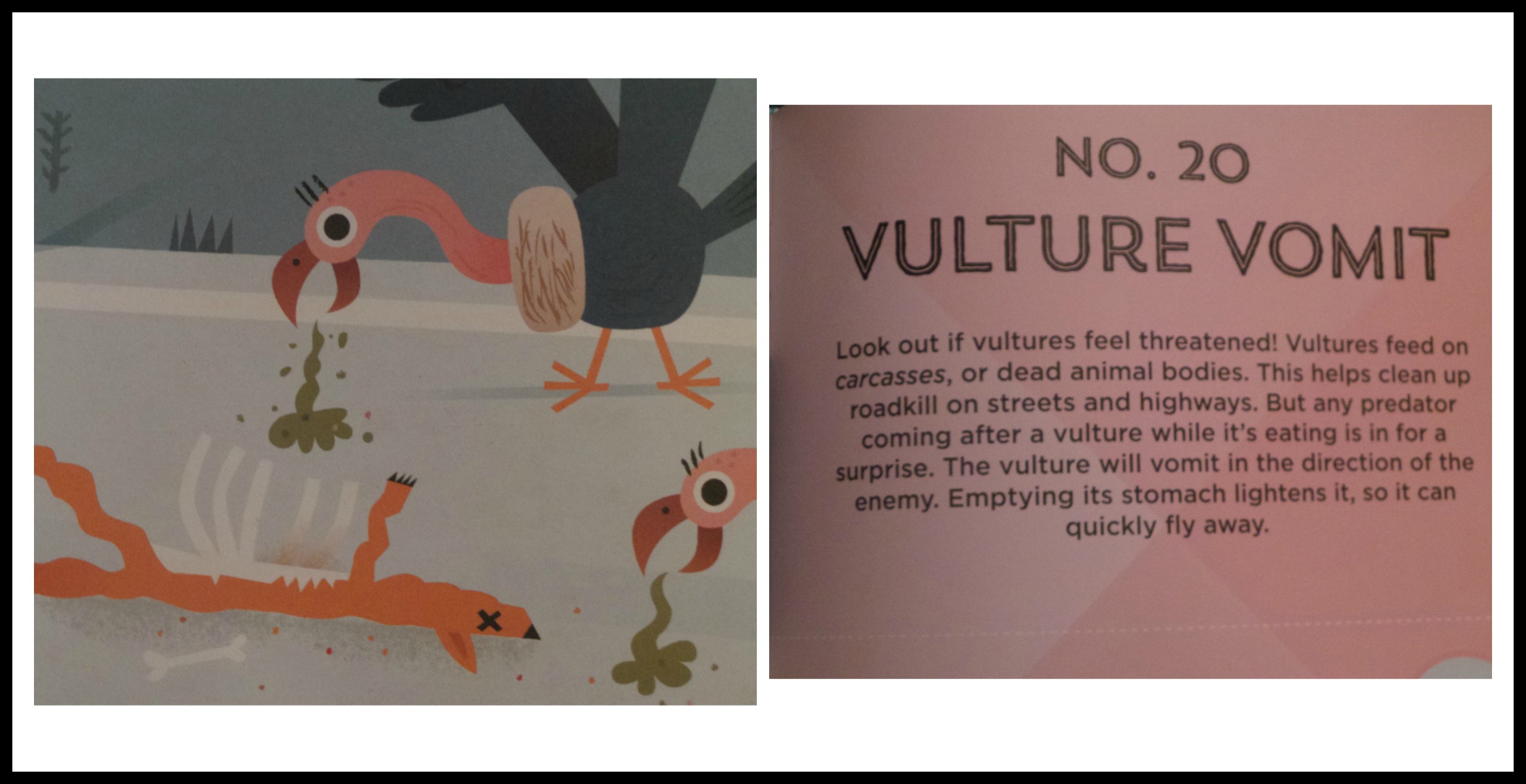 50 Wacky Things Animals Do is like that in the fact that children remember the weird and wacky facts about things. I can go into our 7 year old’s class and ask them what animal cleans their ears with its tongue or who vomits when it’s threatened by another animal? It’s been four weeks since I read this book to them and they still remembered that a giraffe cleans its own ears and that vultures vomit when threatened (so that they can rapidly fly away).