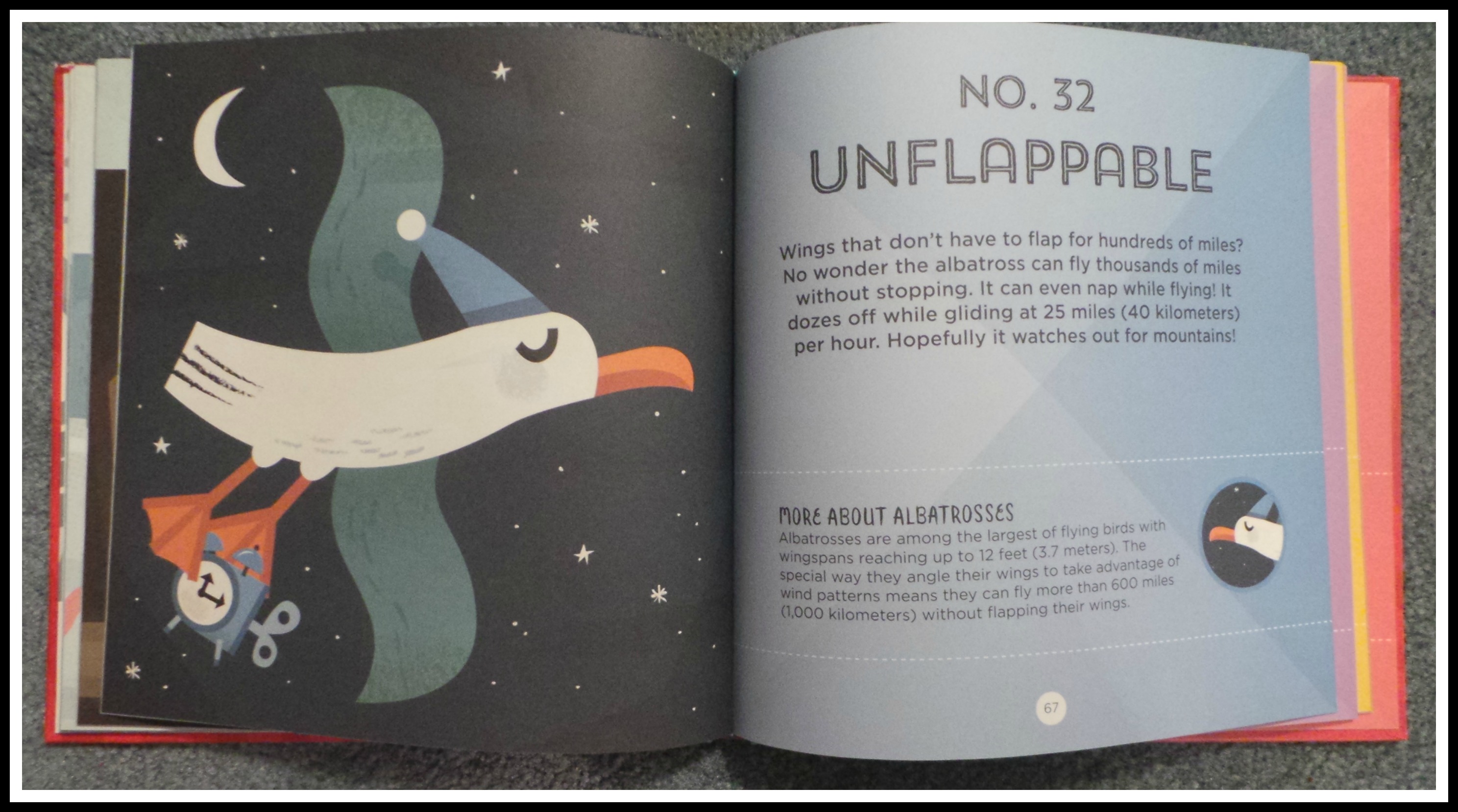 Animal 32 is actually an albatross. The albatross’ page has unflappable on it due to the animal’s ability to glide for hundreds of miles without flapping its wings. It can even nap while flying as it glides at up to 25 miles an hour.