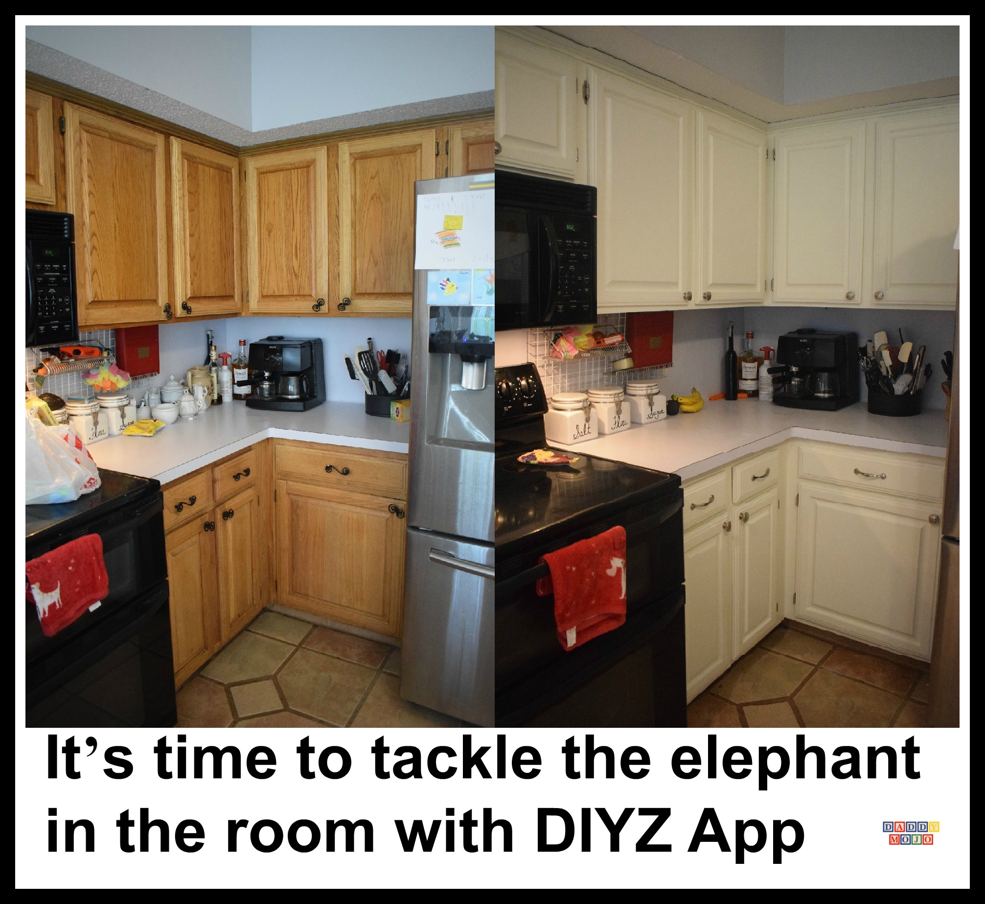 We needed to do something about our kitchen. It’s not that we’re selling our home; we just need to be ready in case it has to be sold quickly or we wanted to stop cooking in a room that hadn’t been updated since Growing Pains first aired. Combine that with the fact that Mother’s Day is coming up and we had to get going. Do we paint the kitchen cabinets ourselves or have someone else do it or get all new cabinets? That final choice was far too expensive and hiring someone to paint kitchen cabinets would’ve cost upwards of $3,000. With a little encouragement from DIYZ App we jumped into a relatively simple, but at the same time gargantuan task of painting our kitchen cabinets.